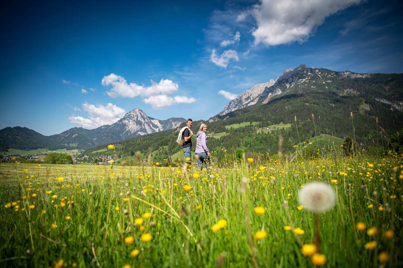 Ausgangspunkt "Hotel Reisslerhof" - Die kleine "GENUSSRUNDE" bezaubert durch schöne Wiesen- und Waldwege mit einem herrlichen Blick nach Gröbming, mit Stoderzinken und in die Schladminger Tauern.