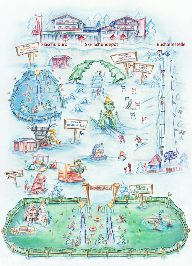 Das Erlernen der ersten Skiübungen - Bremsen und Kurvenfahren gelingt euch dort bestimmt.