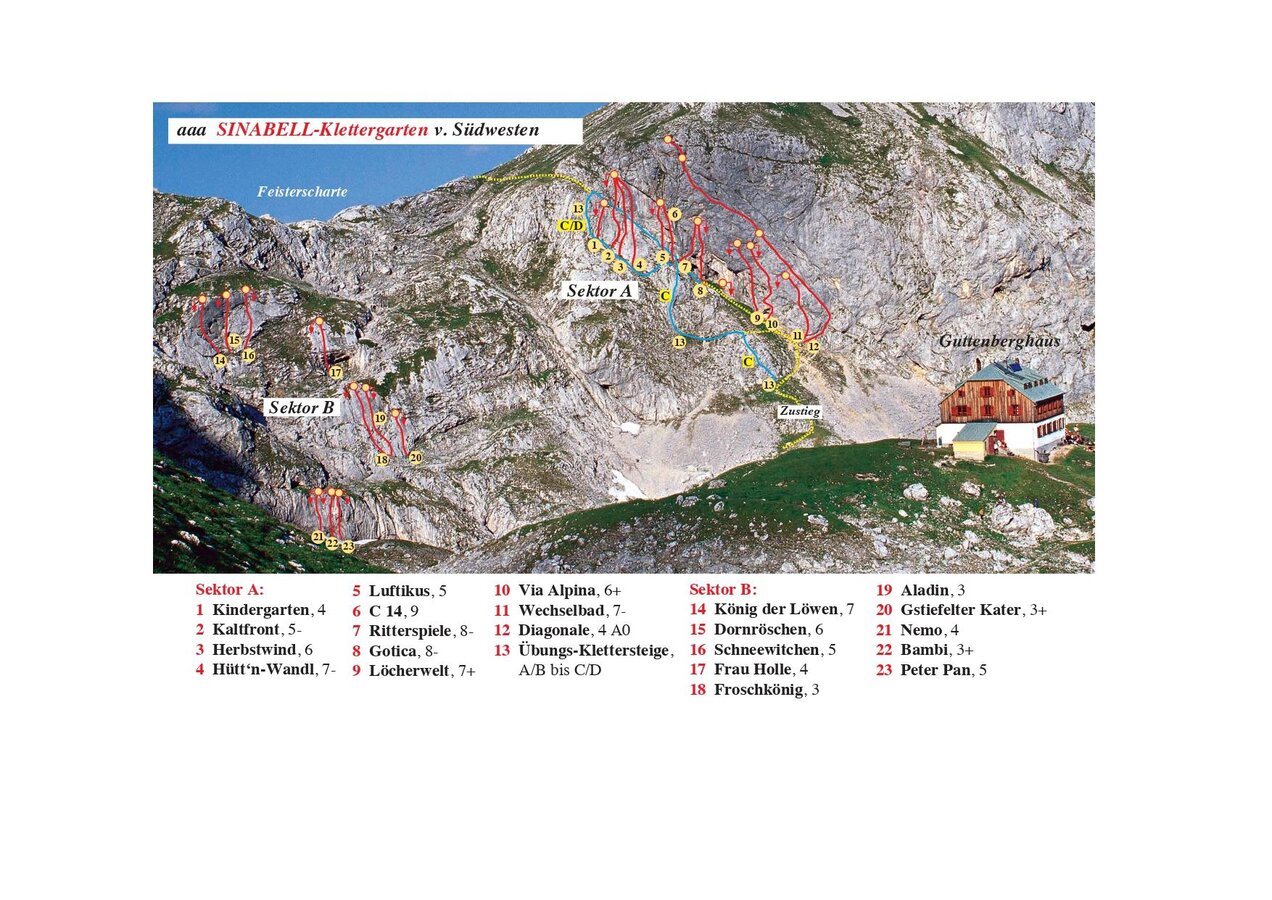 Im Nahbereich des schön gelegenen Guttenberghauses befindet sich ein sehr gut abgesicherter Klettergarten mit zwei Sektoren. Im Sektor A herrschen vor allem athletische Wandklettereien im kompakten Kalkgestein ab dem 6. Grad vor, während im Sektor B hauptsächlich Schwierigkeiten zwischen 3. und 5. Grad an mittelsteilen Platten. Daher ist der Klettergarten auch für Kinder und Anfänger bestens geeignet.