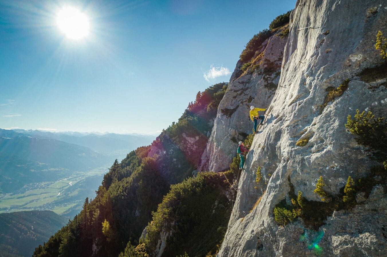 Mit grandiosem Ausblick über das Ennstal und die umliegenden Berge ist bereits der Zustieg zu den Klettersteigen ein Erlebnis. Der Florasteig erfordert ohne Klettersteigausrüstung auf jeden Fall Trittsicherheit und Schwindelfreiheit!