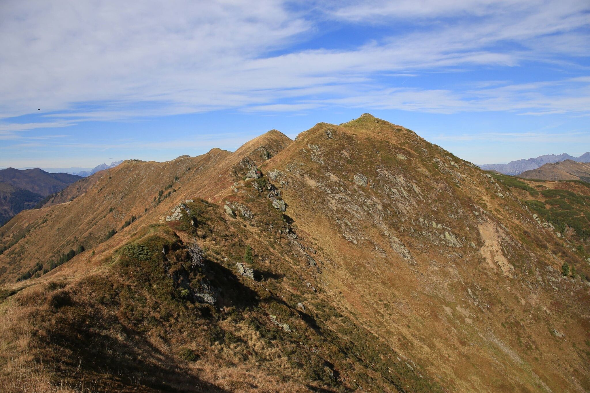 Ein paar hundert Höhenmeter hilft uns die Seilbahn bis zur Mittelstation. Dort ausgestiegen laufen wir nach links hinein in den Lärchenwald und flach hinüber zur Finsterkaralm. Am Finsterkarsee fällt die Entscheidung für eine erste Rast leicht. Stetig und am Ende in Serpentinen erreichen wir den Grat der uns von nun an begleitet. Der Finsterkarspitz ist unscheinbar und wird weglos mitgenommen bietet aber einen faszinierenden Tiefblick auf den Finsterkarsee. Am Gr. Bärneck haben wir den höchsten Punkt erreicht und mit Sicherheit einen der besten Aussichtspunkte. Für den weiteren Verlauf gibt es nun drei Varianten: