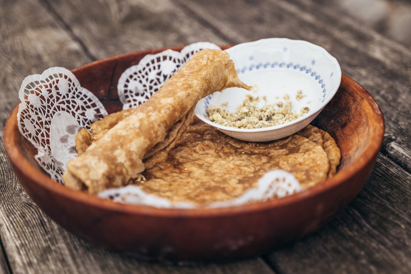 Die Zutaten zunächst zu einem Teig vermischen und diesen dann zu daumendicken Rollen formen. Davon rund 10 Zentimeter lange Stücke abschneiden und zu dünnen tellergroßen Roggenkrapfen auswalken. Danach in sehr heißem Schmalz kurz auf beiden Seiten schwimmend herausbacken, auf einer Küchenrolle abtropfen lassen und zudecken.