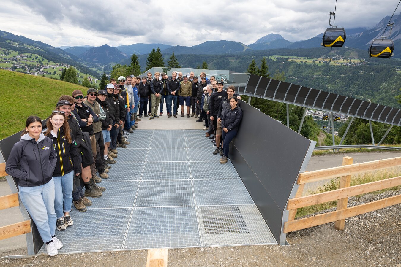 Besonders beeindruckend: Die neue Brücke ist mehr als nur eine Überführung – sie ist ein echter Aussichtspunkt! Auf der integrierten Plattform eröffnet sich ein atemberaubender Panoramablick auf das Dachsteinmassiv, die Planai-Seilbahn und den beliebten Step-Up-Sprung. Ob Selfie, Gruppenbild oder spektakuläre Actionaufnahme: Dieser Spot wird garantiert einer der meistfotografierten Orte im Bikepark Schladming.