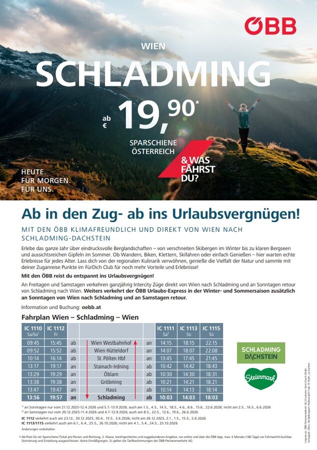 ÖBB-Urlaubs-Express: In den Winterferien zusätzlich an Sonntagen von Wien nach Schladming/Stainach-Irdning und an Samstagen retour.