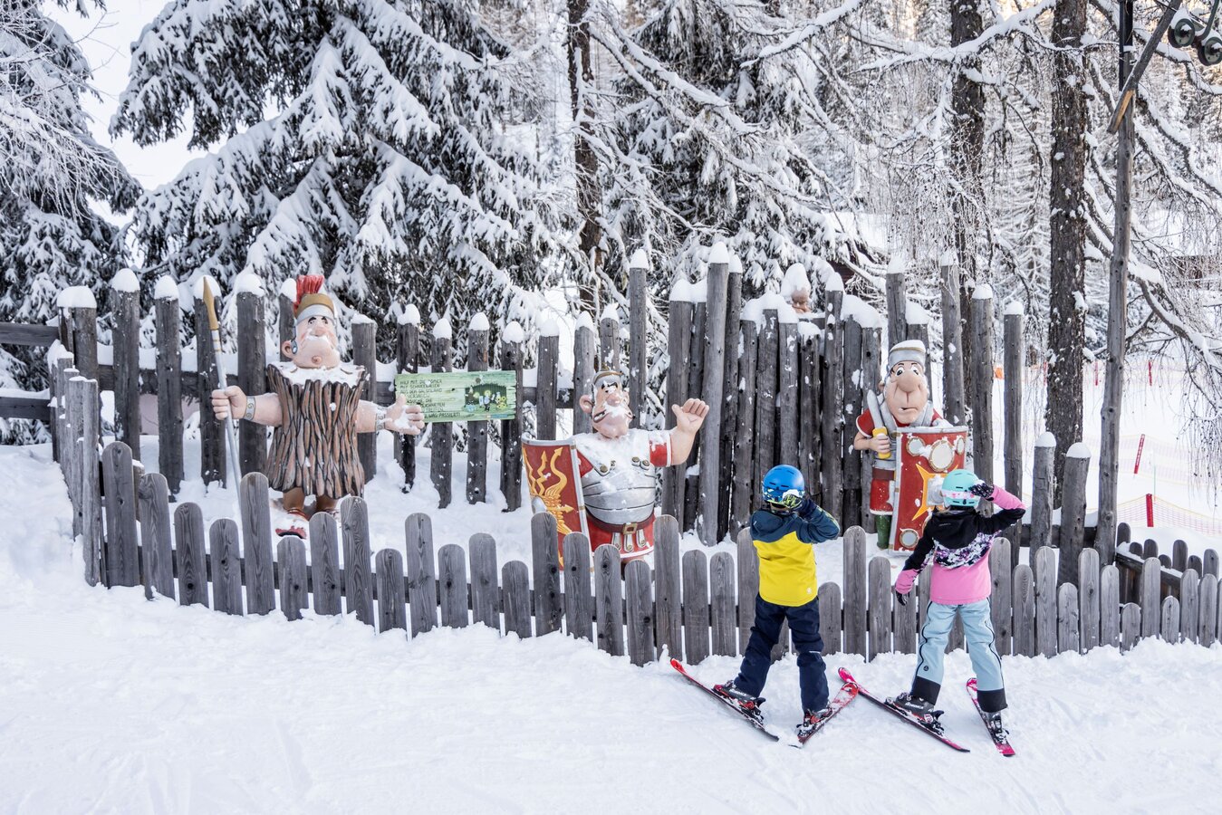 Im gallischen Skidorf können bereits die Kleinsten ihre ersten Schwünge ziehen. Dabei sorgen sprechende Figuren und gallische Holzhütten für jede Menge Spaß und Spiel.