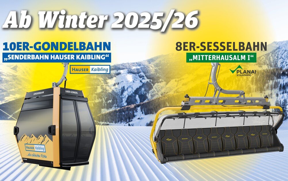 Die Skiberge Hauser Kaibling und Planai arbeiten im Sommer an zwei zukunftsweisenden Infrastrukturprojekten in der 4-Berge-Skischaukel: Ab Dezember 2025 sorgen die neue 10er-Gondelbahn „Senderbahn Hauser Kaibling“ und die 8er-Sesselbahn „Mitterhausalm I“ auf der Planai für noch schnellere, komfortablere und effizientere Verbindungen zwischen den beiden Skibergen.