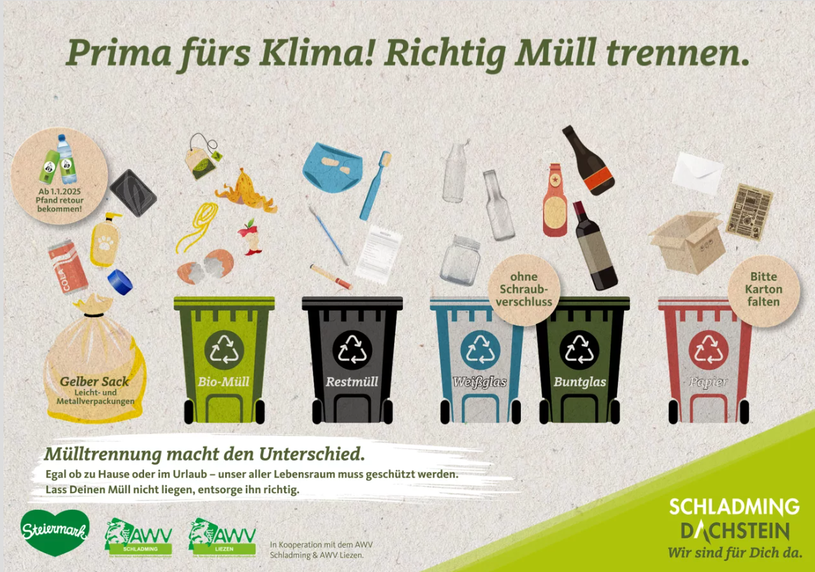 Eine einfache, aber wichtige Maßnahme ist zum Beispiel die korrekte Mülltrennung - damit kann jeder von uns einen wertvollen Beitrag leisten. Jede richtige Mülltrennung spart wertvolle Ressourcen, schützt unser Grundwasser und hilft die Natur, die du hier genießt, auch für zukünftige Generationen zu bewahren. So schonen wir Ressourcen und tragen zum Klimaschutz bei. Ein einheitlich und übersichtliches Informationsblatt soll Gastgebern und Gästen der Region dabei helfen, durch die richtige Trennung von Restmüll, Kunststoff, Glas, Papier und Bioabfall einen Beitrag zu einem sauberen Lebens- und Erholungsraum zu leisten.