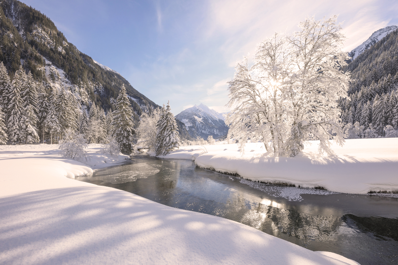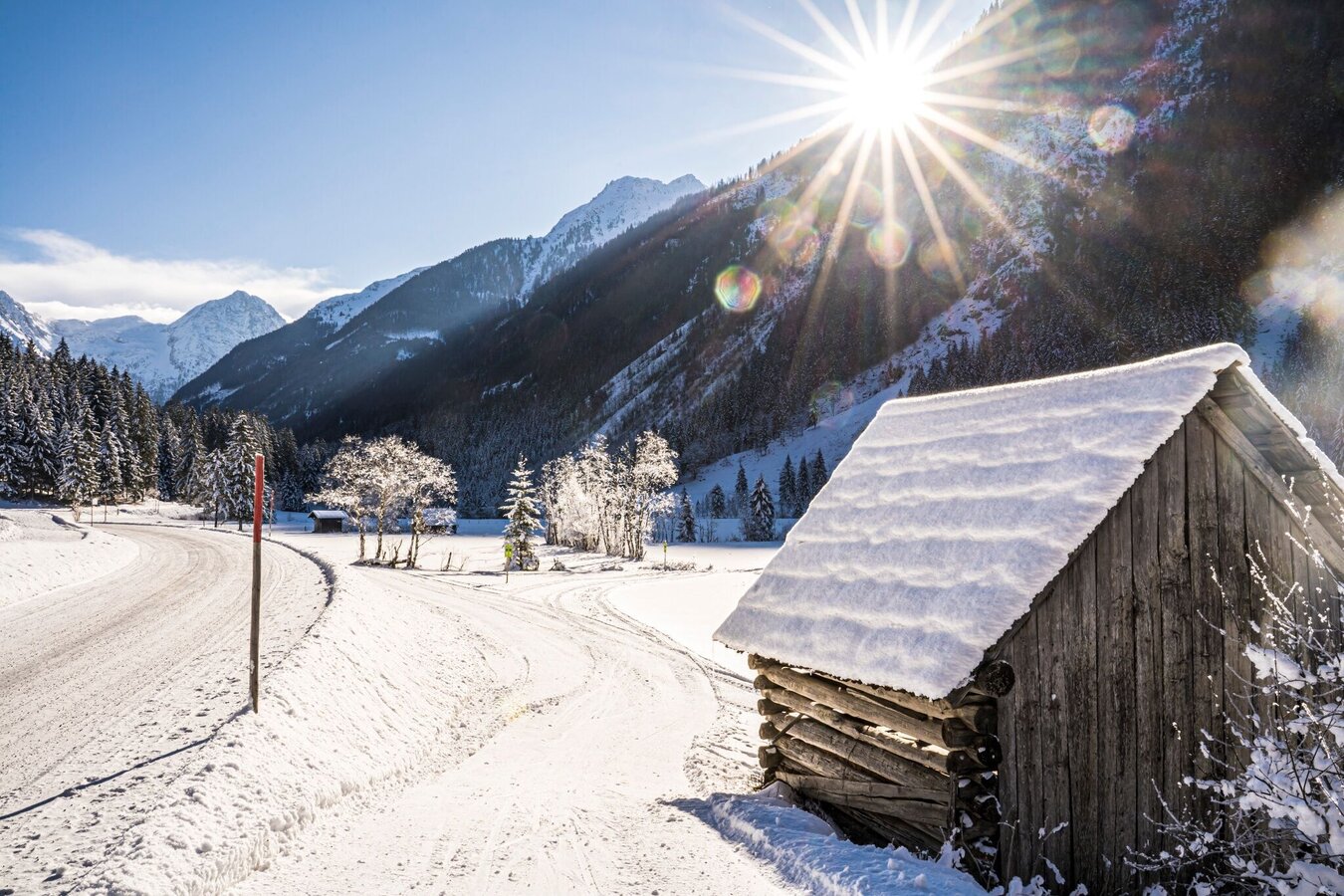 Auf gut präparierten Wegen wanderst du entlang des Baches, vorbei an verschneiten Almen und beeindruckenden Aussichtspunkten – perfekt für ruhige Stunden in der Natur.