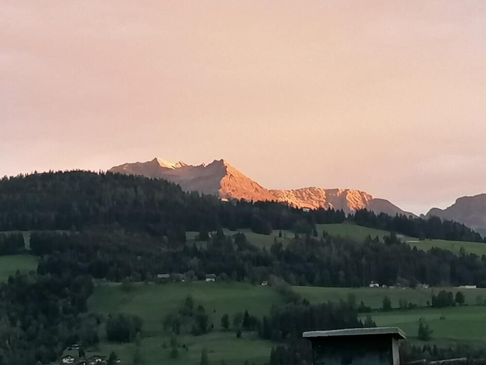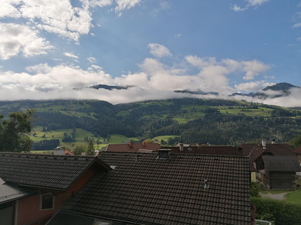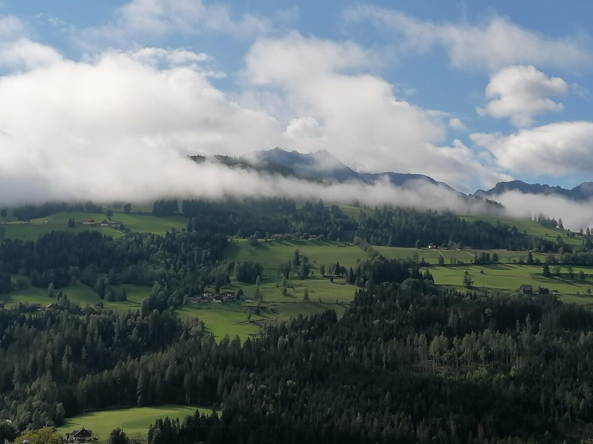 Tolle Sicht auf unsere Hausberge, Planai und Hauser- Kaibling, wobei im Winter der Schibus nur 150m vom Haus entfernt an/ab fährt.