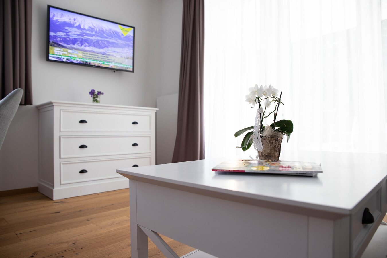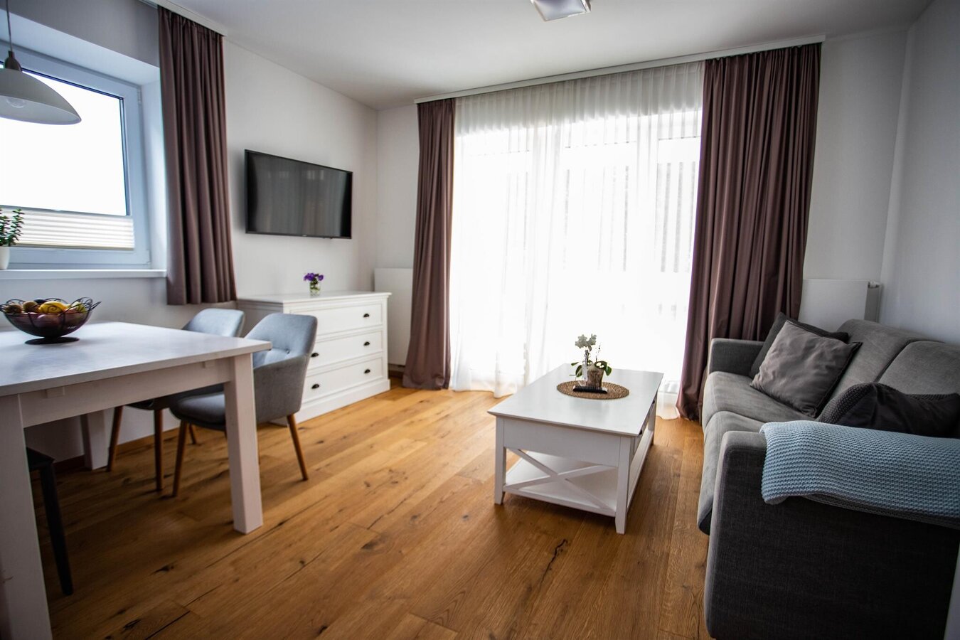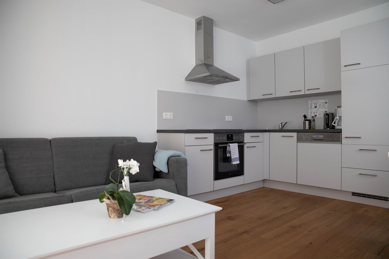 Zeitgemäßes Design, helle Farben, ein Holzboden und eine moderne Ausstattung mit allem was das Herz begehrt machen die Appartements Freiraum zum gemütlichen Refugium mit eigener Terrasse.
