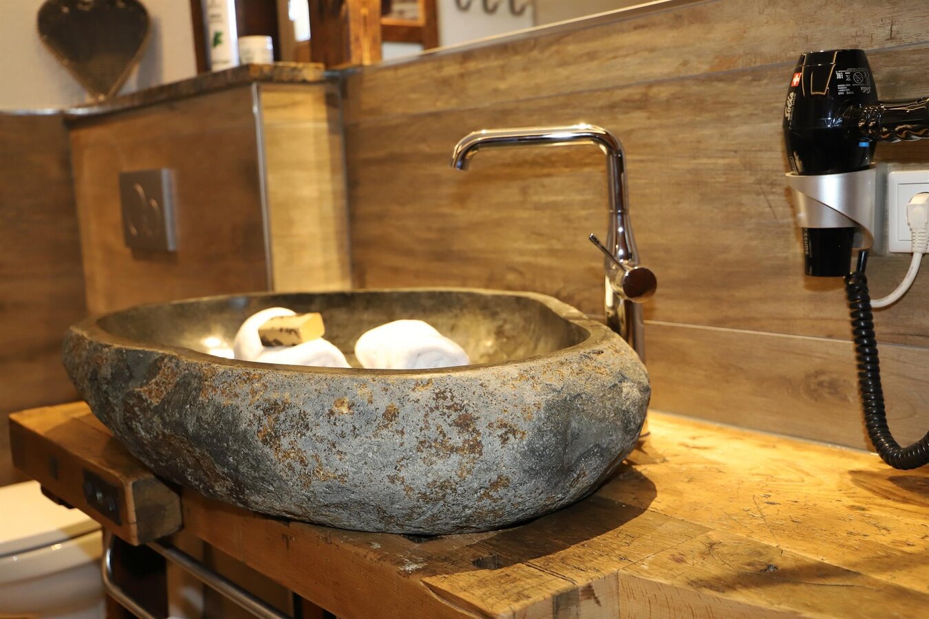 Im liebevoll gestalteten Bad im Anschluss an die Wohnküche finden Sie eine Dusche, ein WC, ein exquisites Waschbecken, Kosmetikspiegel, Fön und einen Handtuchtrockner.