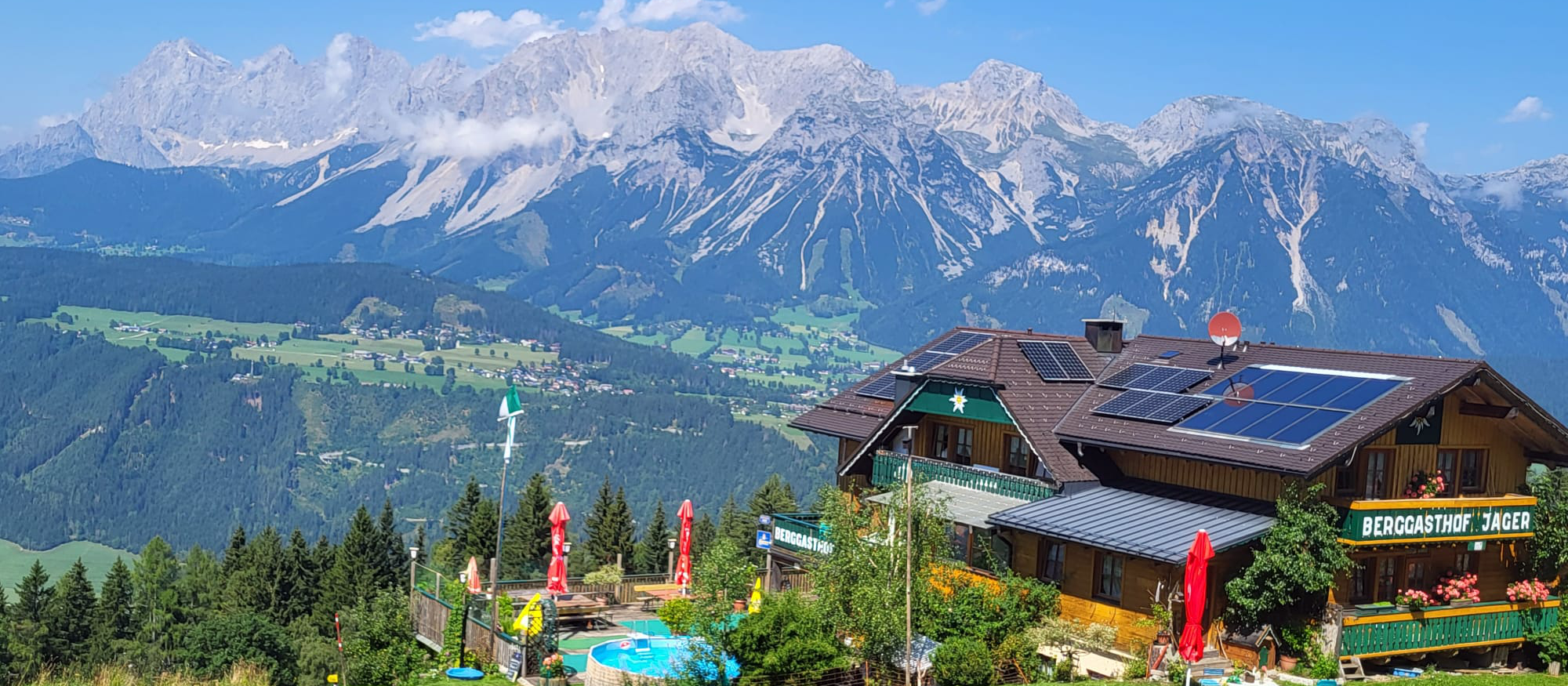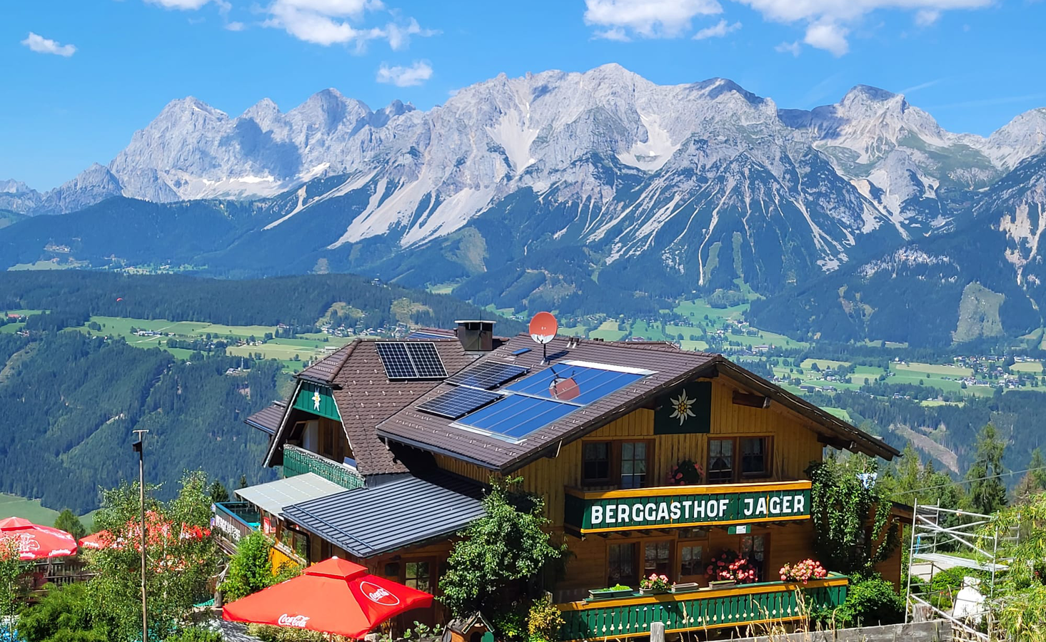 Einzigartiger freier Panoramablick auf das gesamte Dachsteinmassiv.