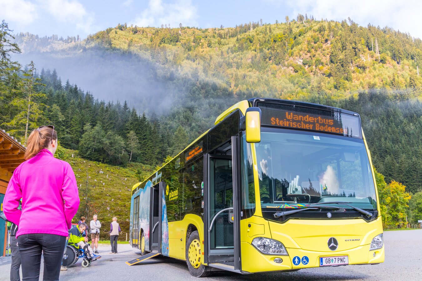 Um zum Naturjuwel Steirischer Bodensee zu gelangen, fährt in den Sommermonaten ein Wanderbus vom Planet Planai über Haus im Ennstal und Weißenbach zum Parkplatz Steirischer Bodensee. Das Auto darf gerne am Parkplatz Planet Planai abgestellt werden und mit der Schladming-Dachstein Sommercard ist diese Busfahrt inkl. Maut kostenlos bzw. ist diese Buslinie (ausgenommen Mautgebühr) auch im KlimaTicket Steiermark bzw. Österreich inkludiert.
