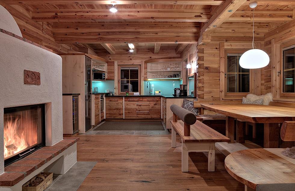 Das Chalet mit insgesamt 170m2 Wohnfläche erstreckt sich über drei Stockwerke. Im Erdgeschoß befindet sich ein großer offener Bereich, der in Küche, Essbereich und Wohnen aufgeteilt ist. Die Küche ist mit Elektroherd, Kühlschrank, Gefrierfach, Mikrowelle, Backrohr, Nespressomaschine und Spülmaschine sowie mit einer Bierzapfanlage voll ausgestattet. Ein Weinkühlschrank mit einer erlesenen Auswahl an Weinen & Schaumweinsorten (zum Selbstkostenpreis) darf natürlich auch nicht fehlen. Der große Esstisch im Erker bietet Platz für bis zehn Personen und die gemütliche Sitzgruppe mit Plasma TV lädt zum Entspannen und zu gemütlichen Abenden ein. Den Mittelpunkt im Wohnbereich bildet der schöne offene Kamin. Von hier gelangt man auf die große Südterrasse, die mit hochwertigen Gartenmöbeln, Liegestühlen und einer Lounge-Ecke sowie einem Webergrill ausgestattet ist. Ebenfalls auf diesem Stockwerk befinden sich noch ein Doppelschlafzimmer, ein Badezimmer mit Dusche sowie ein separates WC.