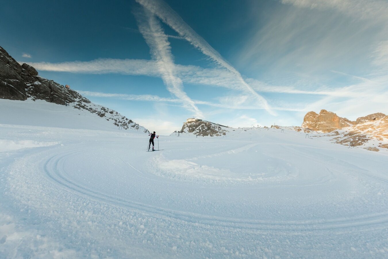Die Ramsauer Loipe ist die kürzere der beiden hochalpinen Gletscherloipen auf dem Dachstein Gletscher und bietet Dir Gletscher-Langlauf mit tollem Blick in Richtung Grimming und zum Krippenstein.