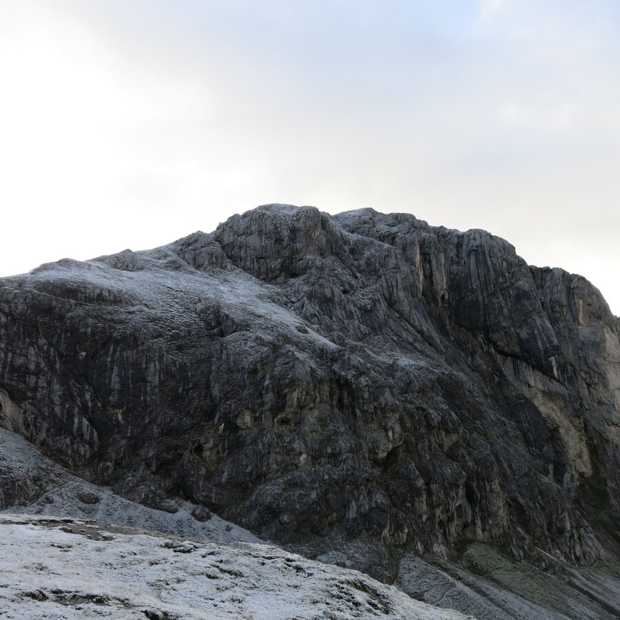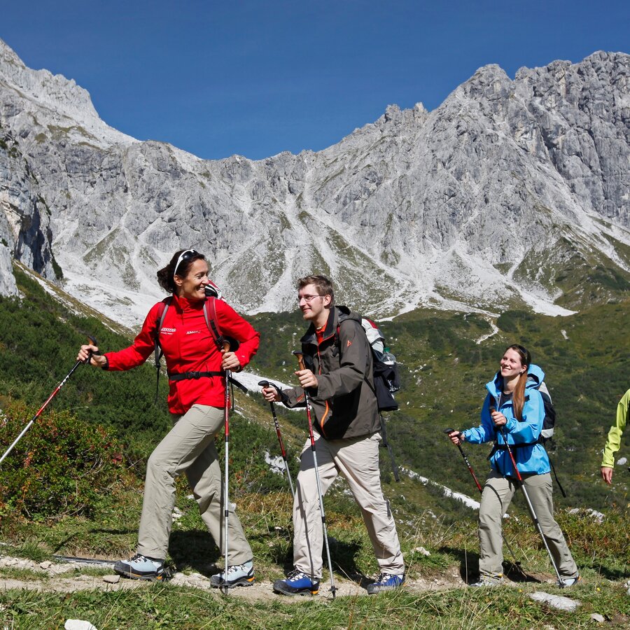 Die beiden Varianten führen uns schließlich zum selben Ort, an die Bergstation Hunerkogel. Von hier sollte man spätestens um 16:00 Uhr starten, um das Etappenziel gut zu erreichen. Wir laufen vorbei am Gjaidstein, wo wir links des Sesselliftes abwärts Richtung Osten gehen. Wir orientieren uns an den farbigen Markierungen auf den Felsen und an den Schneestangen. Auch die „Taube“, ein Steinmandl, können wir als Orientierungspunkt nehmen. An der Markierung 674 ist der Schnee oft noch gefroren, deshalb sollte man hier trittsicher und vorsichtig sein. Außerdem sollte man hier Stöcke zur besseren Sicherung dabei haben und gut auf das Wetter achten, denn auf der hochalpinen Wanderung bis zu unserem heutigen Etappenziel gibt es keinen Unterschlupf. Bei der Feisterscharte folgen wir dem Weg 616 und sind nach einem kurzen, steilen Abstieg beim Guttenberghaus.
