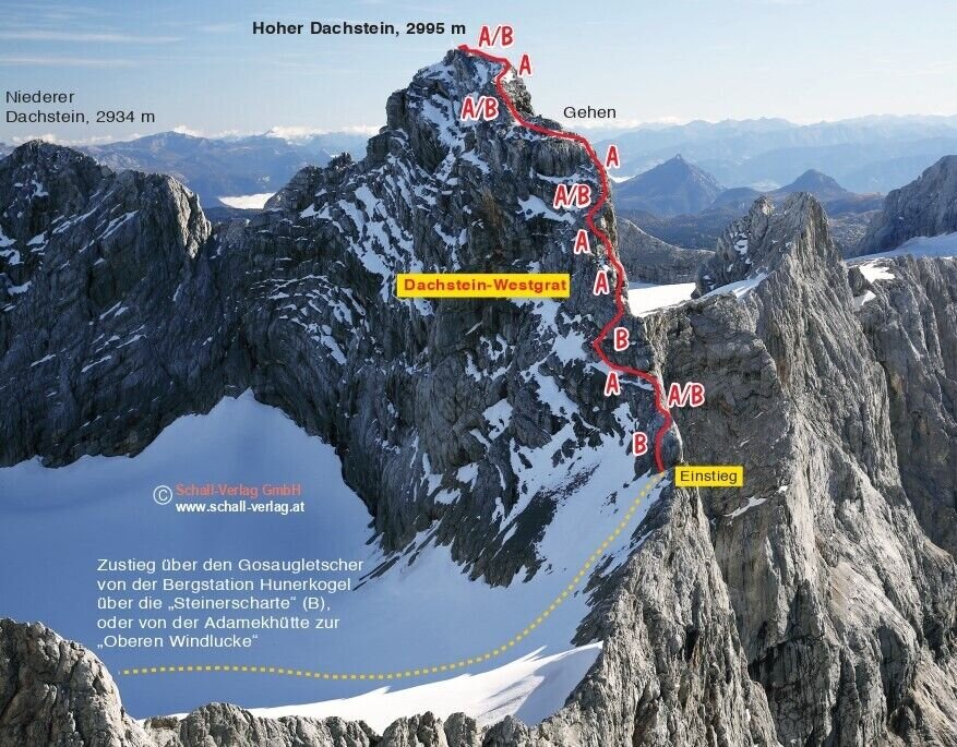 Bis kurz vor die Seethalerhütte, weiter zur Steinerscharte (teilweise Stahlseilversicherung bis B) und westseitig wieder absteigen bis zum Gosaugletscher (mit Steigeisen und Seilsicherung). Von dort in südlicher Richtung aufwärts bis zur oberen Windluke und davor links abwärts zum Fuß des Westgrates (Beginn der Sicherung).