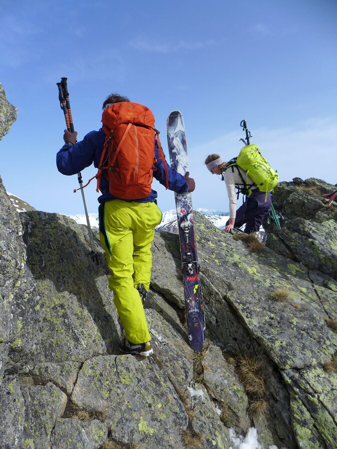 - Skitourenausrüstung bestehend aus Skiern/ Splitboard, Fellen, Stöcken und evtl. Harscheisen.