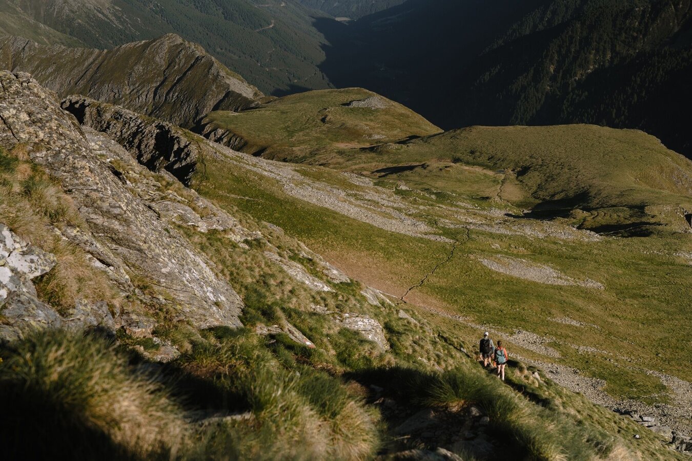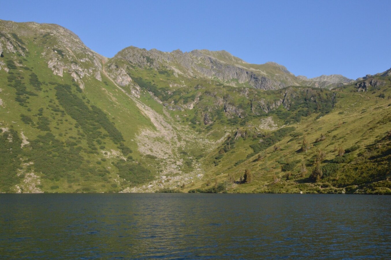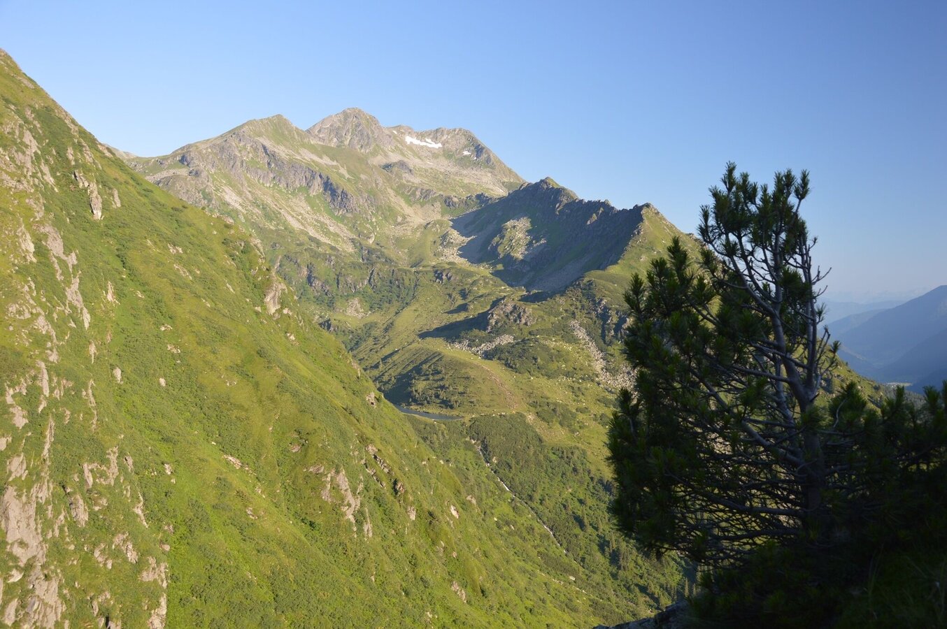 Allerdings sind die nächsten Ziele nicht weniger reizvoll: am linken Uferrücken geht es wieder steil über einen Felssporn hinauf in ein kleines Kar. Ein gischtender Bach ist der nächste Anhaltspunkt, denn dort führt der Steig über eine kurze, aber steile Felsschulter hinauf zu den Etrachböden. Das ist eine sanft gegliederte weite Hochfläche mit einem herrlichen Rundumblick in die Gipfelwelt der Tauern. Der Tiefblick hinunter zu den Seen u. den markanten Straßenkehren der Sölkpaßstraße ist eindrucksvoll und zeigt deutlich den schon überwundenen Höhenunterschied. Hier oben lässt es sich aushalten; kleine Bächlein durchschneiden die Wiesen, die von sanften Kuppen gegliedert werden.