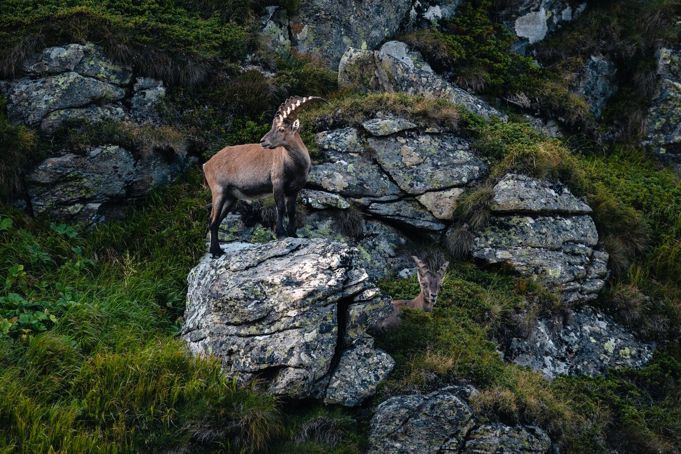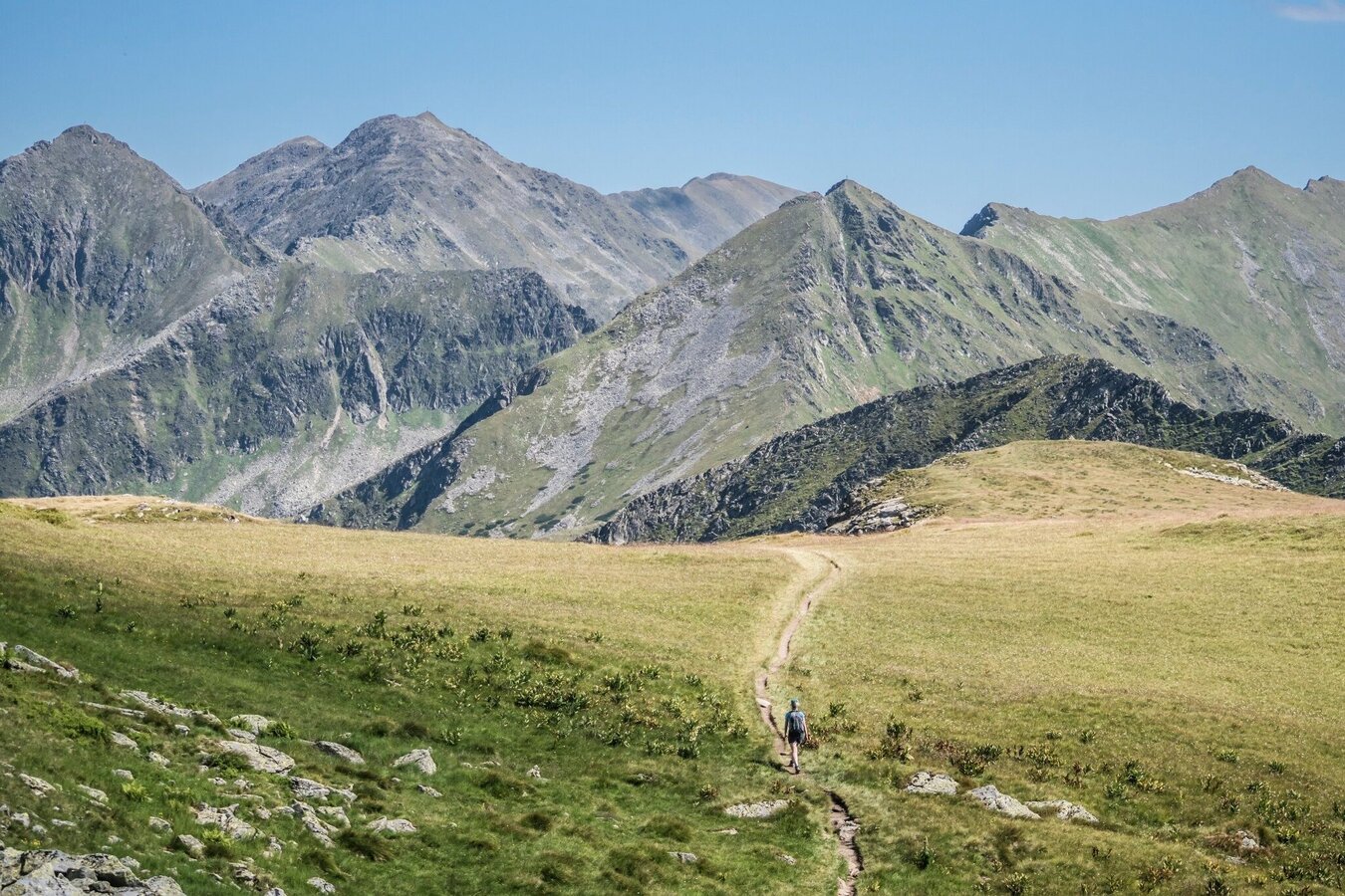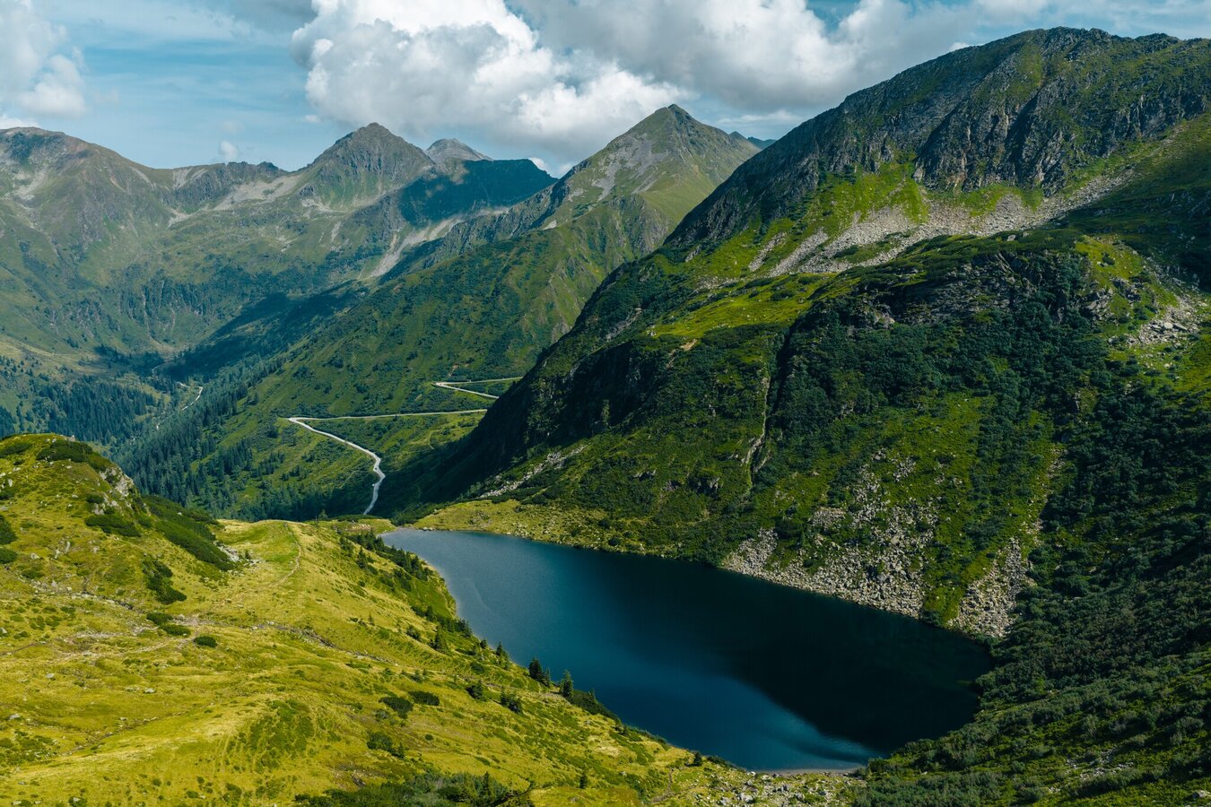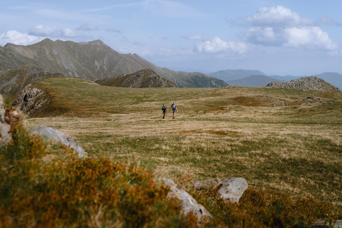 Allerdings sind die nächsten Ziele nicht weniger reizvoll: am linken Uferrücken geht es wieder steil über einen Felssporn hinauf in ein kleines Kar. Ein gischtender Bach ist der nächste Anhaltspunkt, denn dort führt der Steig über eine kurze, aber steile Felsschulter hinauf zu den Etrachböden. Das ist eine sanft gegliederte weite Hochfläche mit einem herrlichen Rundumblick in die Gipfelwelt der Tauern. Der Tiefblick hinunter zu den Seen u. den markanten Straßenkehren der Sölkpaßstraße ist eindrucksvoll und zeigt deutlich den schon überwundenen Höhenunterschied. Hier oben lässt es sich aushalten; kleine Bächlein durchschneiden die Wiesen, die von sanften Kuppen gegliedert werden.