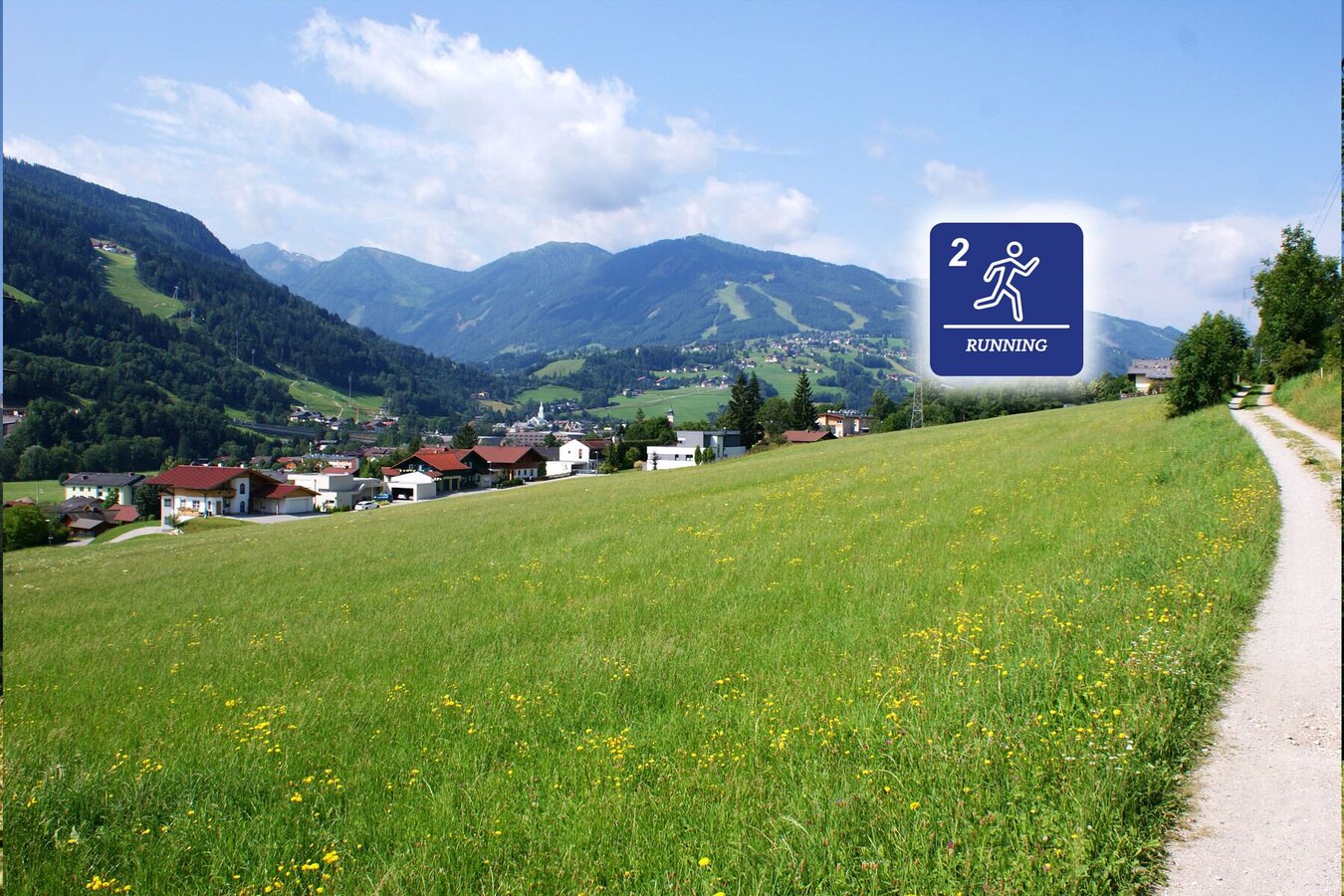Über den Gollobsteg (so heißt der Ennssteg beim Hotel Vital) überquerst Du die Enns und läufst durch die WM-Siedlung zum Fußweg der den Bahndamm entlang verläuft. Diesem folgst Du - vorbei an der neuen Athletic Area Schladming - bis zum Bahnübergang in der Nähe der Abzweigung Birnberg. Hier überquerst Du die Bahngleise und läufst einige Meter in Richtung Birnberg bevor Du links auf einen Wald- und Wiesenweg (die Römerrunde) abzweigst. Diese läufst Du nun entlang bis der Fußweg nach einiger Zeit in die Hochstraße mündet. Auf dieser bleibst Du nun für die nächsten Kilometer.