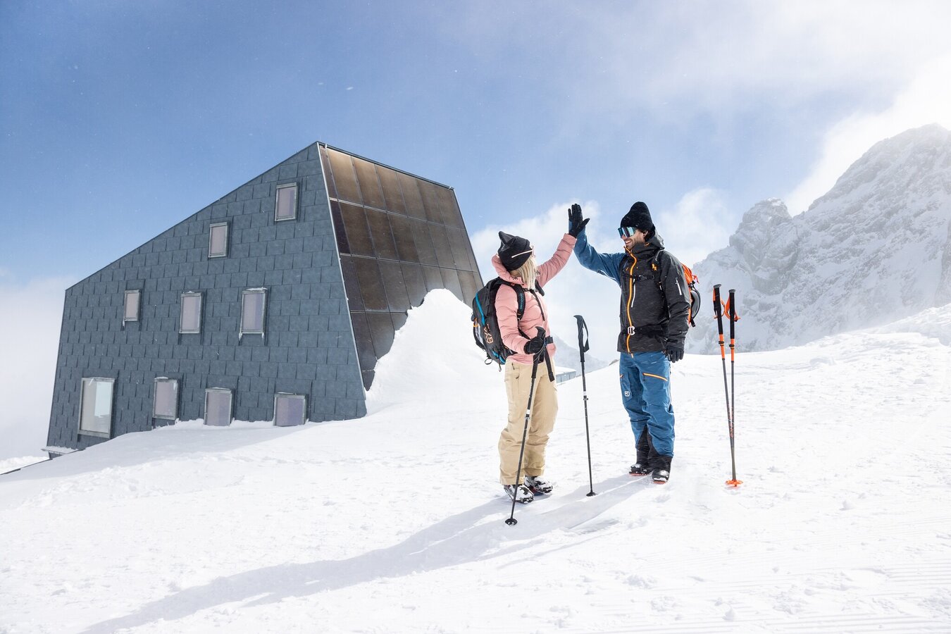 Abfahrt von der Dachstein Bergstation bis unterhalb des Dirndls über den präparierten und markierten Weg. Auffellen und dem Weg in langer Linkskurve vorbei am Schulteranstieg - der zum Dachsteingipfel führt - bis zur Seethalerhütte folgen. Die 2018 markant neugestaltete Hütte liegt zwischen dem Dirndl und dem Hohen Dachstein direkt an der Dachstein Südwand. Rückweg wie Hinweg.