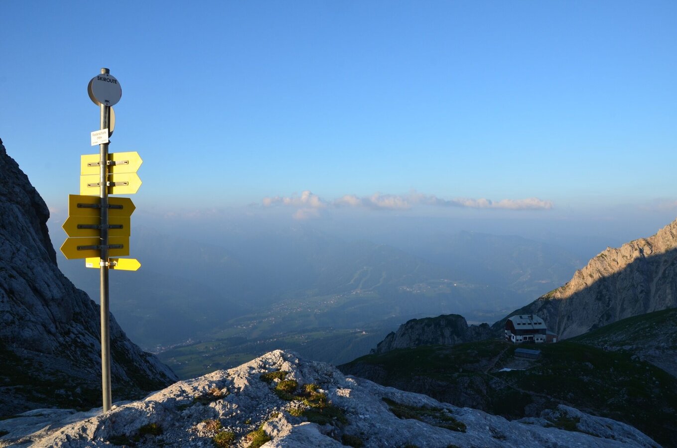 Vorbei am Gipfel des Landfriedsteins und Eselsteins gelangen wir zur Feisterscharte, wo 2 Steige aufeinandertreffen. Der Weg Nummer 616 führt weiter über die Hochfläche "Am Stein" zum Krippenstein im Norden des Dachstein Plateaus und der Weg Nummer 618 weiter zum Stoderzinken im Westen, unserem Ziel der 2. Etappe auf der Nordroute der Wanderroute "Vom Gletscher zum Wein". Wir aber steigen den Weg Nummer 616 zum bereits sichtbaren Guttenberghaus (Tel. +43 664 3022956) mit den gut 1.000 m tiefer gelegenen Almen und Wiesen der Ramsau ab und freuen uns schon auf die gute steirische Küche mit Aussicht auf die Schladminger Tauern. Jetzt steht die Entscheidung an: nehmen wir die 2. Etappe auf der Nordroute oder die 2. Etappe auf der Südroute!?