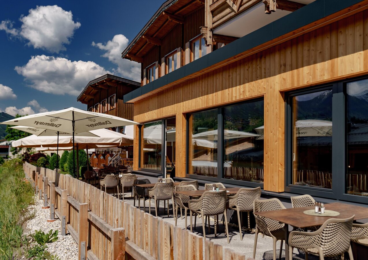 Weitläufige Sonnenterrasse mit Aussicht auf Planai und Schladming