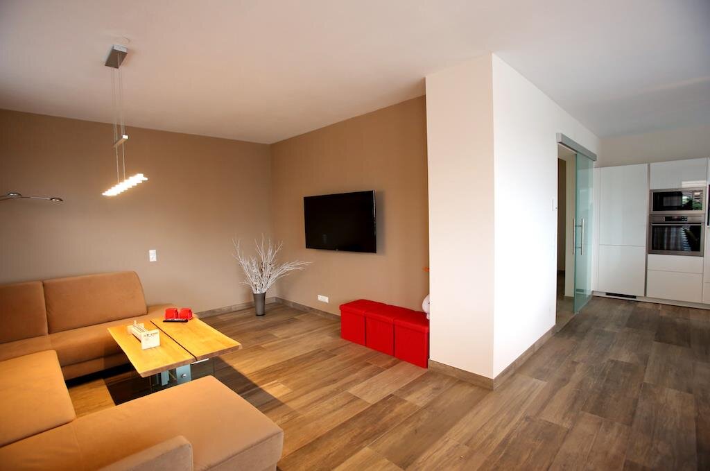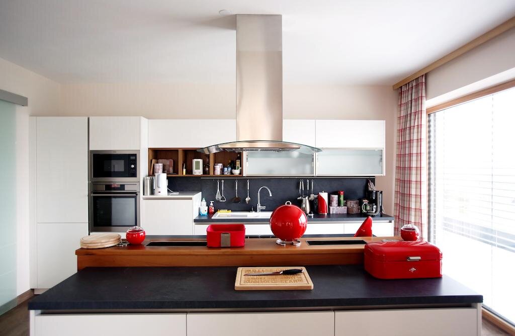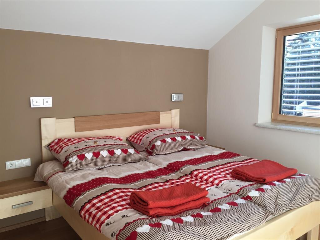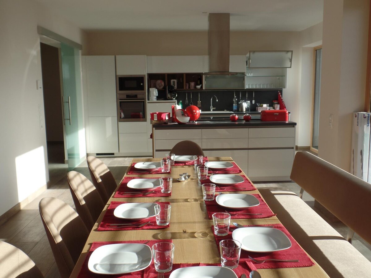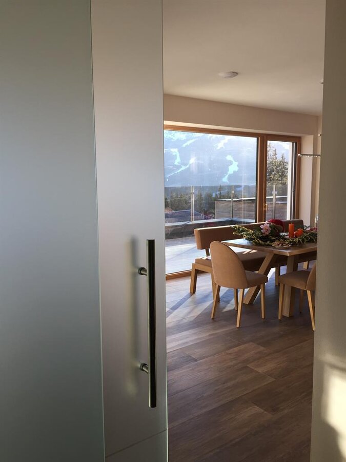 Wir gehen in den ersten Stock. Wenn Sie die Glastür öffnen, werden Sie sofort von der herrlichen Aussicht überwältigt werden. Von der Küche und Wohnzimmer haben Sie immerhin einen Panoramablick auf die Skiberge. Die Terrasse ist nach Süden ausgerichtet. Die Küche ist perfekt ausgestattet. Natürlich werden Sie Töpfe und Pfannen finden, Geschirr usw., lassen Sie alle in die Küche gehen.