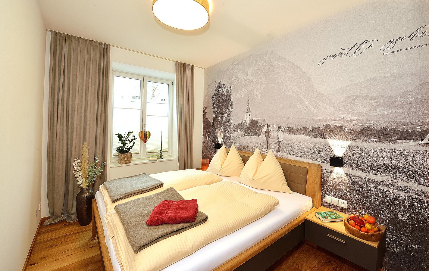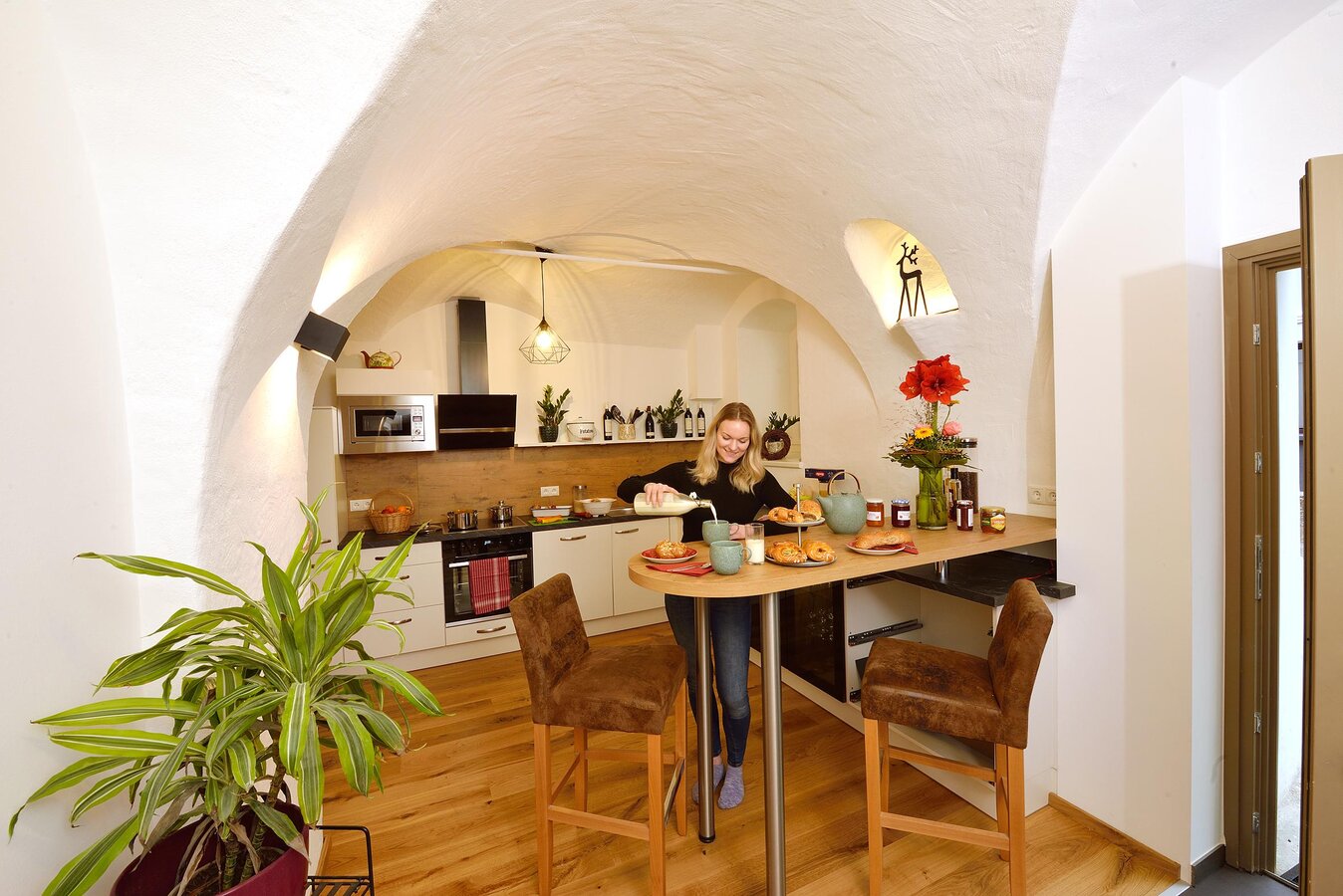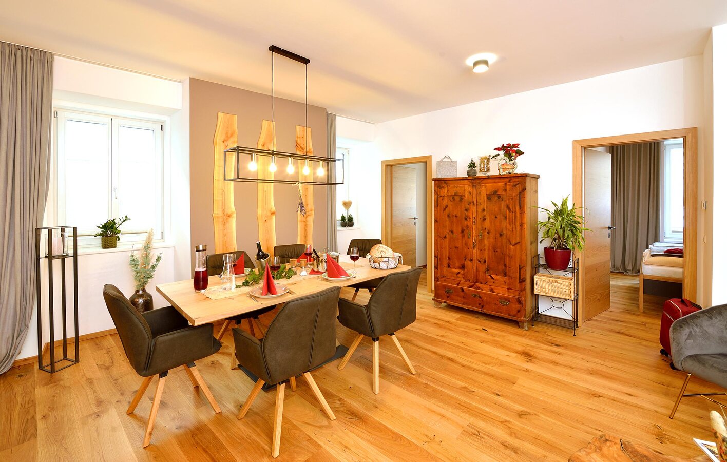 Unsere "Ferienwohnung im Markt" befindet sich in Irdning mitten im Ort und bietet Platz für bis zu 4 Personen. Der Bauernhof ist einige Autominuten entfernt. Wir freuen uns, wenn Sie uns am Bauernhof besuchen. Die Wellnesseinrichtungen am Hof können mitbenutzt werden. Gemütlich und stilvoll mit vielen Naturelementen und dem Flair des "alten Gemäuers" – welches komplett neu saniert wurde – präsentiert sich unsere großzügige Wohnung im Erdgeschoss, direkt im Markt von Irdning. Die Bäckerei gleich um's Eck, Kaufhäuser, Restaurant, Bar sowie Busbahnhof zu Fuß in wenigen Minuten erreichbar ... mitten im Ort – mitten im Geschehen.