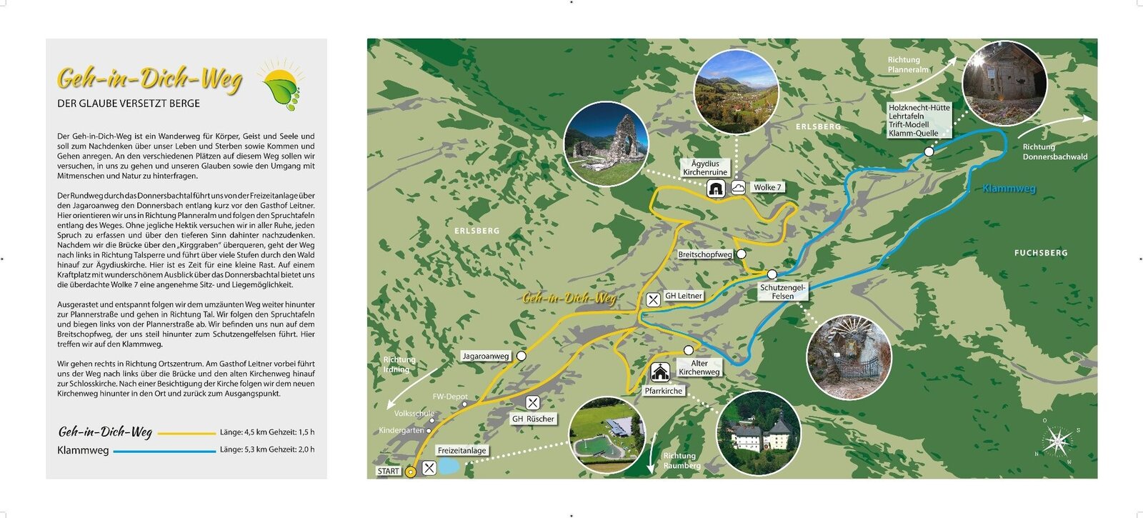 Der Geh-in-Dich-Weg ist ein Wanderweg für Körper, Geist und Seele und soll zum Nachdenken über unser Leben und Sterben sowie Kommen und Gehen anregen. Der Rundweg führt uns über den Jagaroanweg den Donnersbach entlang, danach die Planneralmstraße aufwärts. Nach der Brücke über den „Kirggraben“ geht der Weg nach links in Richtung Talsperre und führt über viele Stufen durch den Wald hinauf zur Ägydiuskirche. Dieser Krafplatz bietet sich für eine kleine Rast an. Wir folgen dem Weg weiter hinunter zur Plannerstraße in Richtung Tal. Wir folgen den Spruchtafeln und biegen links von der Plannerstraße ab. Der Breitschopfweg führt uns steiler hinunter zum Schutzengelfelsen. Hier treffen wir auf den Klammweg. Rechts weiter Richtung Ortszentrum, am Gasthof Leitner vorbei, links über die Brücke und gleich wieder links über die nächste, dann rechts den alten Kirchenweg hinauf zur Schlosskirche. Danach über den neuen Kirchweg hinunter in den Ort und zurück zum Ausgangspunkt.