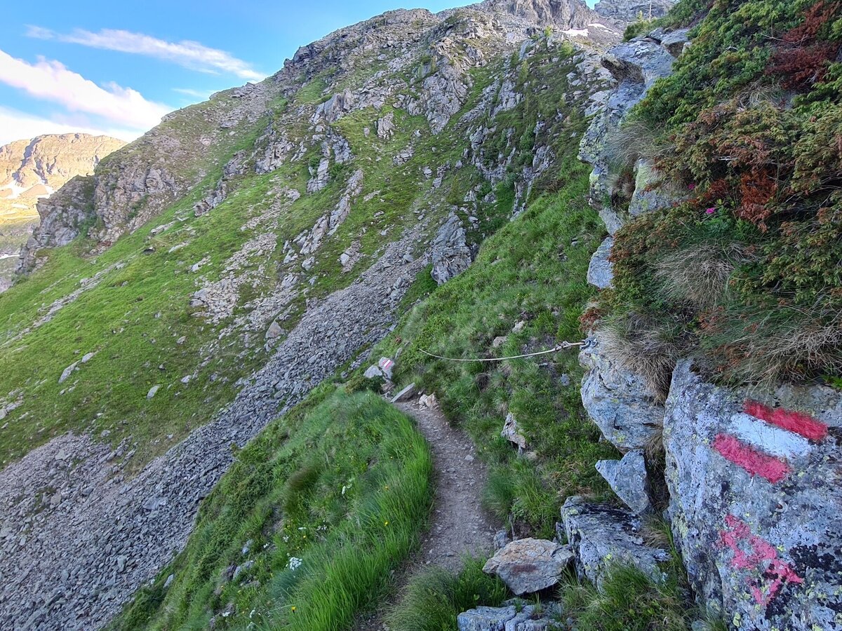 Alpiner Bergwanderweg entlang teils steiler Bergflanken. Steiler Wegabschnitt von der Ferchtlhöhe ins Duisitzkar.