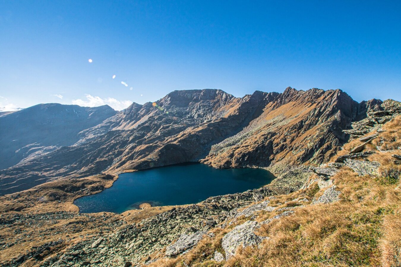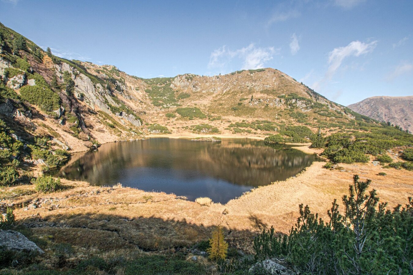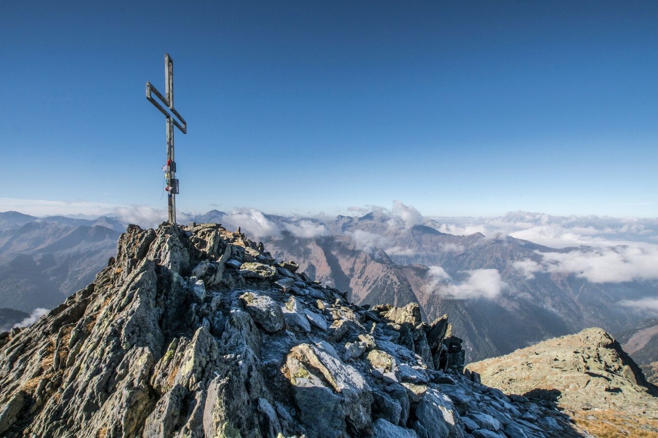 Der folgende Anstieg führt links an den Seen vorbei, dann entlang eines Felssporns bergauf mit einem sehr schönen Blick zurück auf die Seen mit der Schilfinsel und den interessanten Bachmäandern. Dieses Teilstück ist sehr abwechslungsreich und bringt uns relativ rasch zum nächsten, rund 300 m höher liegenden See, dem Weißensee in 2.229 m Seehöhe. Nach der Scharte zeigt sich der gewaltige Gipfelaufbau in seiner ganzen Größe. In einem riesigen Halbrund umschließen die felsigen Kare mit Gipfeln bis zu 2.500 m die Westseite, während der Gipfelanstieg zunächst entlang der Flanke und anschließend über den Grat führt. Erst am Grat hat man auch freie Sicht nach Norden, Westen und Süden. Nach kurzer Strecke am Grat ist der Gipfel auf 2.599 m erreicht.
