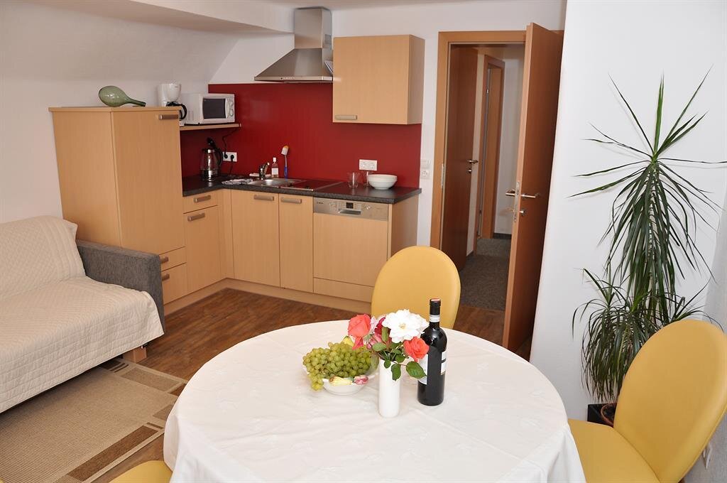 Zudem bieten wir Ihnen komplett ausgestattete Komfort-Ferienwohnungen mit jeweils einem großen Schlafzimmer, einer Wohnküche mit gemütlicher Sitzecke sowie einem sehr geräumigen Badezimmer mit Dusche/WC. Auf Wunsch besorgen wir Ihnen gerne täglich frisches Gebäck oder können sie sich auch mit einem Frühstück verwöhnen lassen ohne auf einen geräumigen Wohnraum verzichten zu müssen. Unser Highlight sind unsere neuwertigen Appartements im 1. OG, welche wir liebevoll mit viel Holz und Licht gestaltet haben.