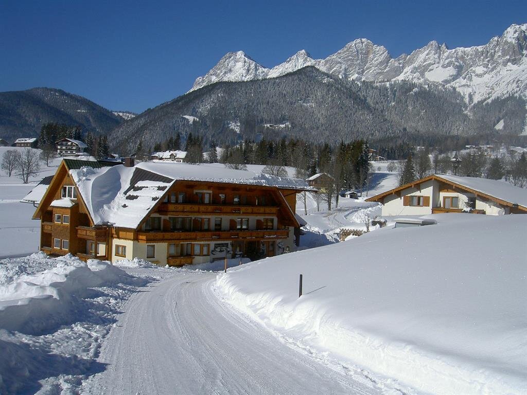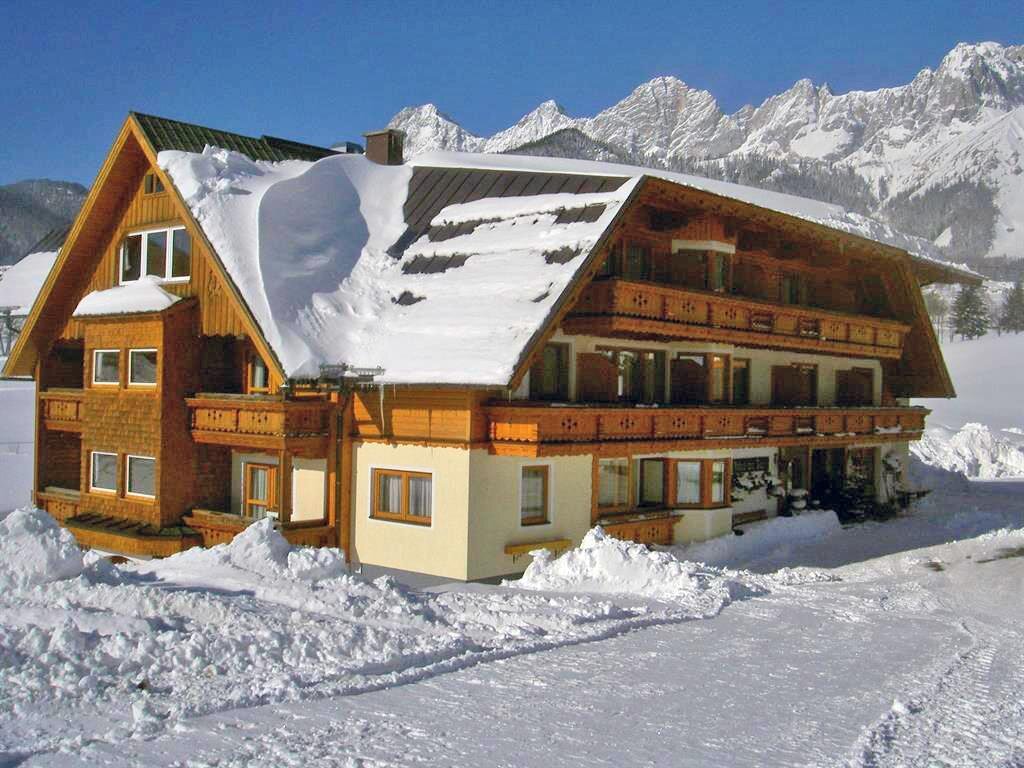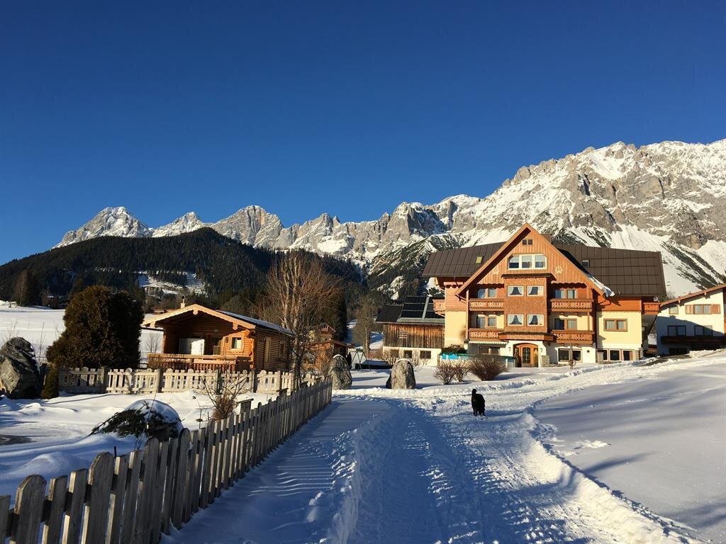 Herzlich Willkommen in unserer familiär geführten 3 Sterne Hotel Pension Haus am Bach, in sonniger und ruhiger Lage, im Urlaubsparadies Ramsau am Dachstein. Familien, Senioren und jung gebliebene Sportbegeisterte können sich in unserer Hotel Pension in Österreich richtig erholen. Die Ramsau am Dachstein ist sowohl im Winter wie auch im Sommer eine der schönsten Urlaubsregionen in Österreich. Der Einstieg in die Winterwanderwege, sowie Langlauf Loipen klassisch und skating befindet sich direkt am Haus. Für Langläufer lässt das 220 km umfassende Loipen-Netz aus Sport- und Skatingloipen keine Wünsche offen. Der Rittisberg mit der Erlebniswinterwelt für Kinder ist nur 5 Autominuten entfernt. Die Skiberge der Skiregion Ski amadé, inklusive der 4-Berge-Skischaukel mit Planai in Schladming-Dachstein, Hauser Kaibling, Hochwurzen und Reiteralm erreichen Sie in 20 Autominuten. Der kostenlose Skibus hält in Hausnähe. Im Sommer sind wir idealer Ausgangspunkt für Wanderungen, Mountainbiken, Klettersteigen, Reiten, Sparziergänge für Senioren und Familien mit Kinderwagen. Unser Hotel Pension Haus am Bach verfügt über helle, gemütliche und komfortable Doppelzimmer (auf Wunsch mit Balkon), sowie über geräumige Ferienwohnungen für 2 bis 5 Personen. Die Zimmer sind mit Dusche/WC, TV und Balkon ausgestattet - die Ferienwohnungen mit Dusche/WC, TV, einer komplett ausgestatteten Wohnküche und getrennten Schlafzimmern. Wlan steht Ihnen im gesamten Haus zur Verfügung. Für Gruppen bieten wir auch einen hellen Tagungsraum für bis zu 50 Personen inkl. Overhead, Beamer, Großleinwand, Flip-Chart, Videorecorder und Musikanlage. Damit keine Langeweile aufkommt, haben wir für Ihre Kinder einen großen Kinderspielplatz und viel Freiraum im Garten parat. Im Sommer können sich unsere kleinen Gäste bei der Rutsche, auf der Schaukel, beim Tischtennis und vielen weiteren Spielgeräten so richtig austoben. Über Streicheleinheiten freuen sich unsere Hasen und Katzen. Bei Schlechtwetter und im Winter lädt das Kinderspielzimmer zum Spielen und Spaßhaben ein. Ausserdem gibt es ein Biotop zum Entspannen und Bestaunen, eine Vogelvoliere mit über 100 Vögeln in 20 verschiedenen Arten. Im Sommer entspannen Sie sich im beheizten Swimmingpool. Relaxen Sie nach einem sportlich aktiven Tag in unserer Dachstein Wellness Oase mit finnischer Sauna, Kräutersauna, Salz-Solegrotte und mit großzügigen Relaxraum mit Blick direktem Blick auf dem Dachstein. Unsere Gäste erwartet ein reichhaltiges Frühstücksbuffet mit regionalen Produkten. Am Abend verwöhnen wir Sie bei einem 3-4 Gänge Menü nach Wahl mit köstlicher Hausmannskost und traditionellen Gerichten, sowie einer großen Salatauswahl. Genießen Sie unbeschwerte Urlaubstage in unserem 3 Sterne Hotel Pension Haus am Bach in Ramsau am Dachstein! Ihre Gastgeber Familie Tritscher