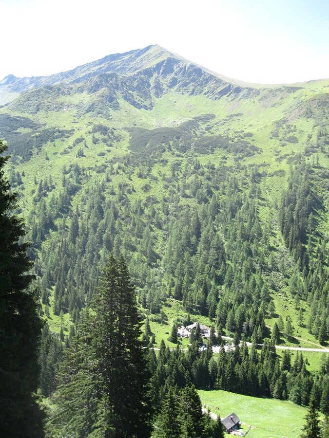 Von den Almböden bei der Hansenalm an der Passstraße sieht man bereits den formschönen Gipfel des Hochstubofen, der den Talschluss beherrscht. Im Sommer findet man hier die purpurfarbenen Blüten des Pannonischen Enzian.