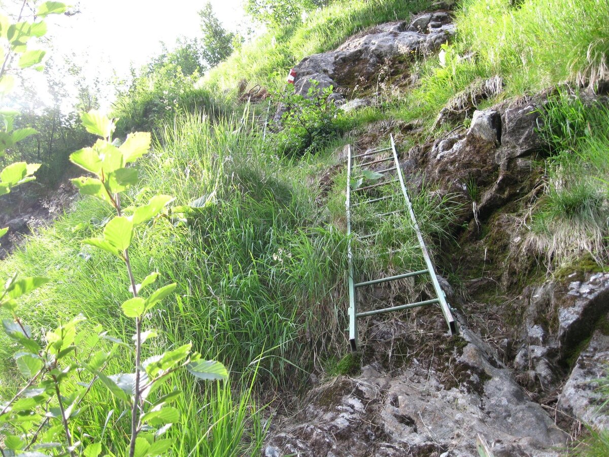 Am Talschluss beginnt der erste steile Aufstieg zum Hohensee. Dort angekommen führt unser Weg hinunter in den hintersten Talschluss und windet sich dann zwischen Erlen und hohen Felsblöcken bis zu einer Felsstufe, die wir mittels einer Leiter überwinden. Dann führt uns der Steig zum Bach, das kleine Tal verengt sich und der Bach wird zum Weg. Nachdem sich uns ein riesiges Hochkar öffnet, führt uns der Steig auf einen markanten Rücken auf der linken Seite am immer steiler werdenden Hang entlang hinauf zur Schimpelscharte.