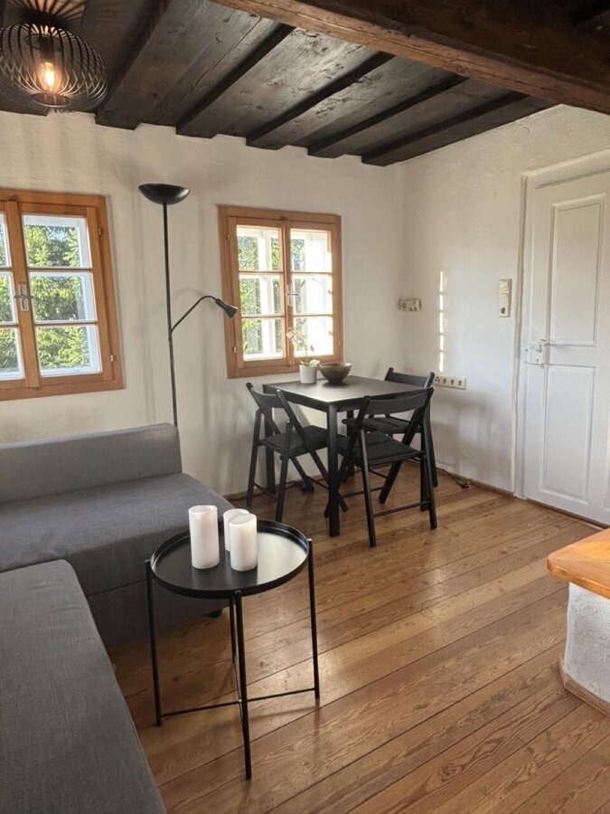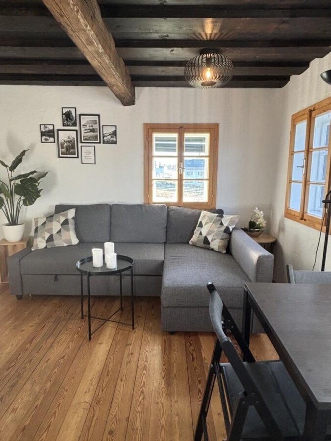 Die voll ausgestattete Küche lädt zum gemeinsamen Kochen ein und bietet alles, was Sie benötigen, darunter einen E-Herd, eine Geschirrspülmaschine, eine Kaffeemaschine, Teekocher, Toaster und diverses Geschirr. Der gemütliche Wohnbereich mit einem traditionellen Kachelofen sorgt für eine behagliche Atmosphäre inkl. Essecke. Das Badezimmer und WC sind in einem tadellosen Zustand und bieten Ihnen den Komfort, den Sie sich wünschen. Außerdem steht Ihnen ausreichend Stauraum zur Verfügung, um Ihre persönlichen Dinge bequem unterzubringen. Im oberen Stock finden Sie das gemütliche Schlafzimmer, ausgestattet mit einem Doppelbett und einem Einzelbett, ideal für Familien.
