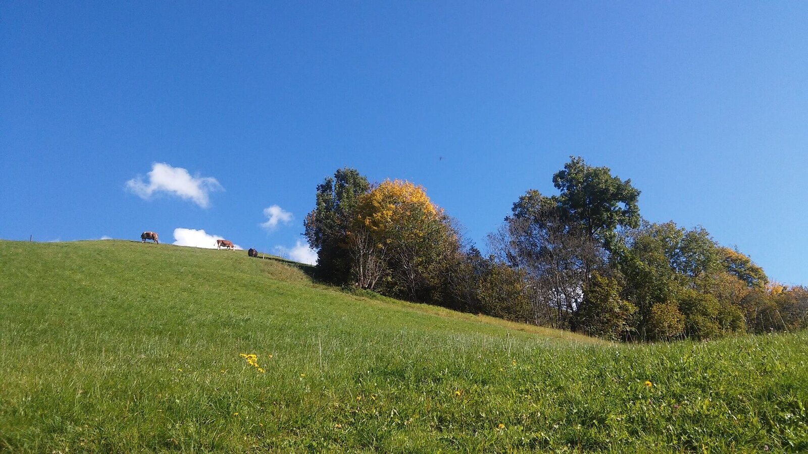 - Wenn du auf Kühe triffst: Am besten oberhalb der Herde mit mind. 50 Meter Abstand vorbei gehen. Verhalte dich ruhig, mache keine hektischen Bewegungen und lauf nicht weg. Ahme auch keine Kuhlaute nach und versuche nicht die Tiere zu streicheln. Mit einem Stock und lautem Rufen können die Tiere im Notfall oft zum Umkehren gebracht werden.