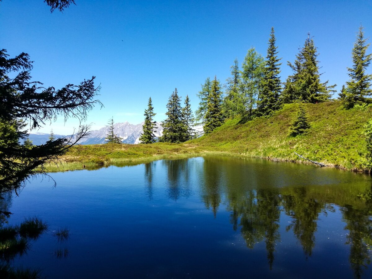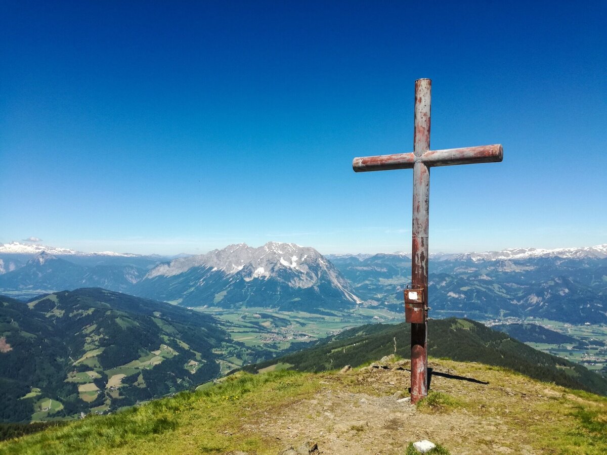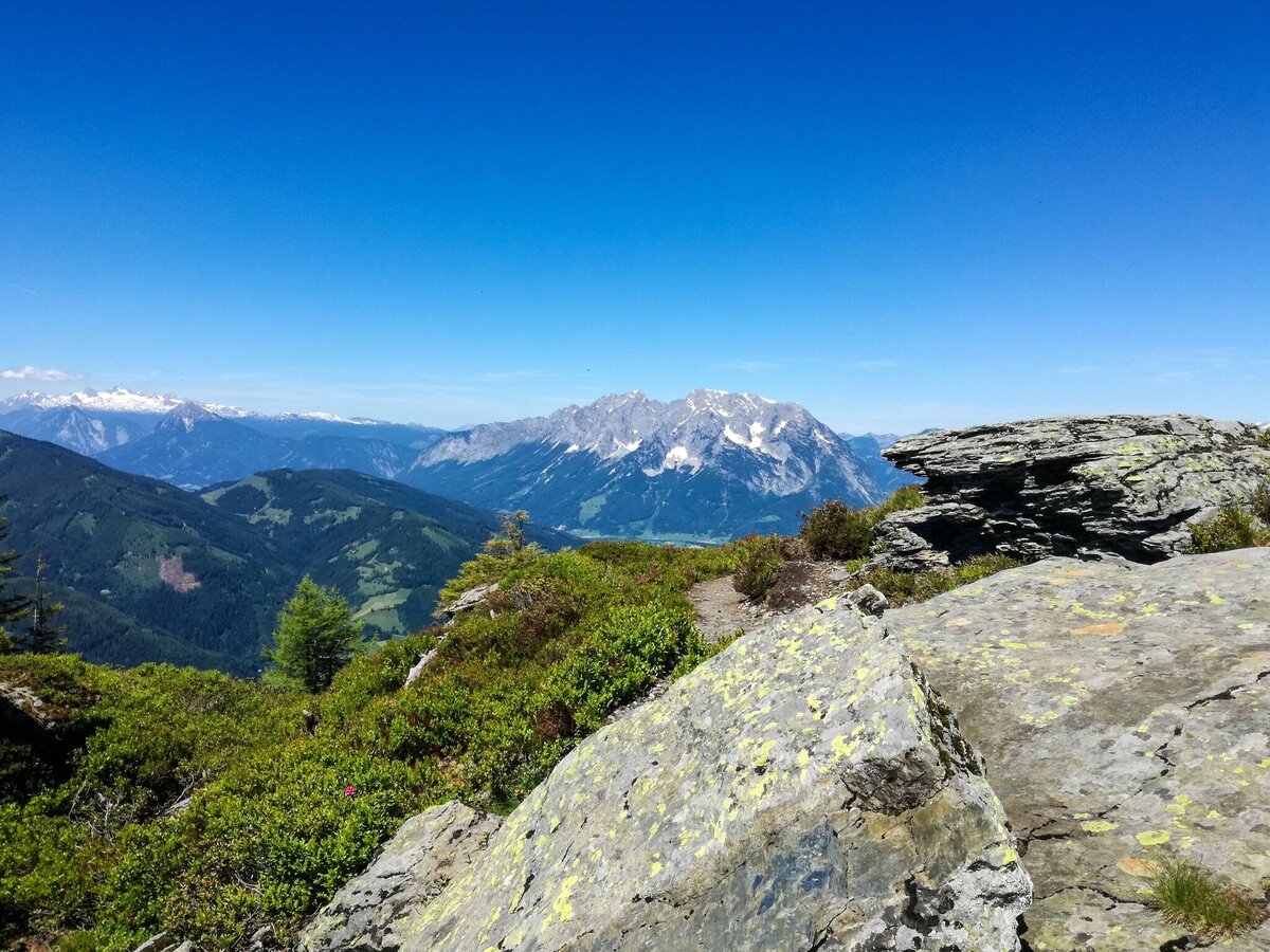 Rechts vor dem Gehöft Hochbär folgst du der Markierung Mölbegg 930 bzw. Hochstein 931. Der Weg führt rauf in den Wald. Bei der Gabelung des Weges im Wald hältst du dich links und wanderst weiter, den steileren Steig bergan bis zur Baumgrenze. Insgesamt querst du dreimal einen Forstweg. Danach kommst du auf einen Hochrücken mit einer Lichtung und einem kleinen See. Kurze Pause einlegen, um ein paar Fotos zu schießen, von dort genießt man einen wunderbaren Blick auf die Gipfel Mölbegg, Edelweißspitze und Hochstein. Weiter geht´s auf einem schmalen Steig bis zur Scharte. An der Abzweigung Mölbegg/Hochstein hältst du dich leicht links und wanderst über die Flanke hinauf bis zum Gipfel. Ein Gipfel mit Wumms, denn er gestattet dir eine 360° Panoramaaussicht vom Allerfeinsten - Grimming fußfrei, versteht sich. Weiterwandermöglichkeit zum Hochstein.