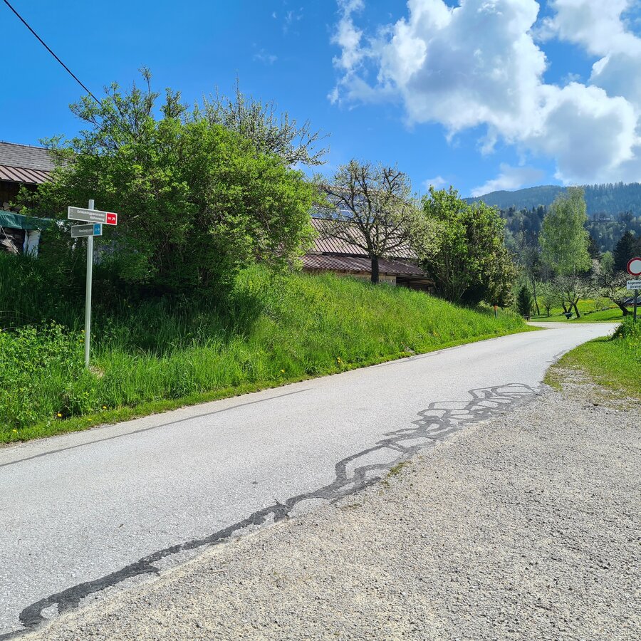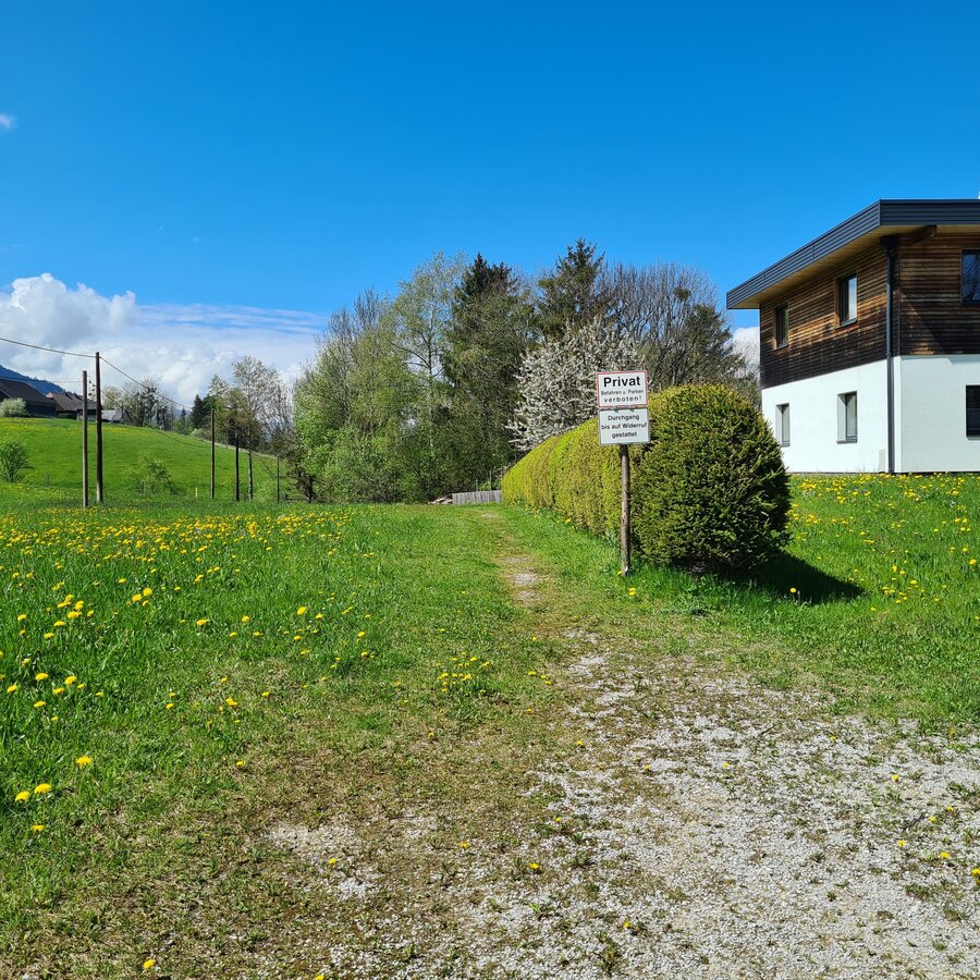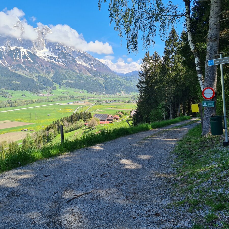 Aussichtsreiche Spazierrunde entlang der Auffahrt Moosberg zum vlg. Moosmoar und im Bereich Sonnberg, mit schönen Ausblicken auf den Flugplatz Niederöblarn, Öblarn, den Mitterberg sowie zur Kammspitze und zum Stoderzinken.