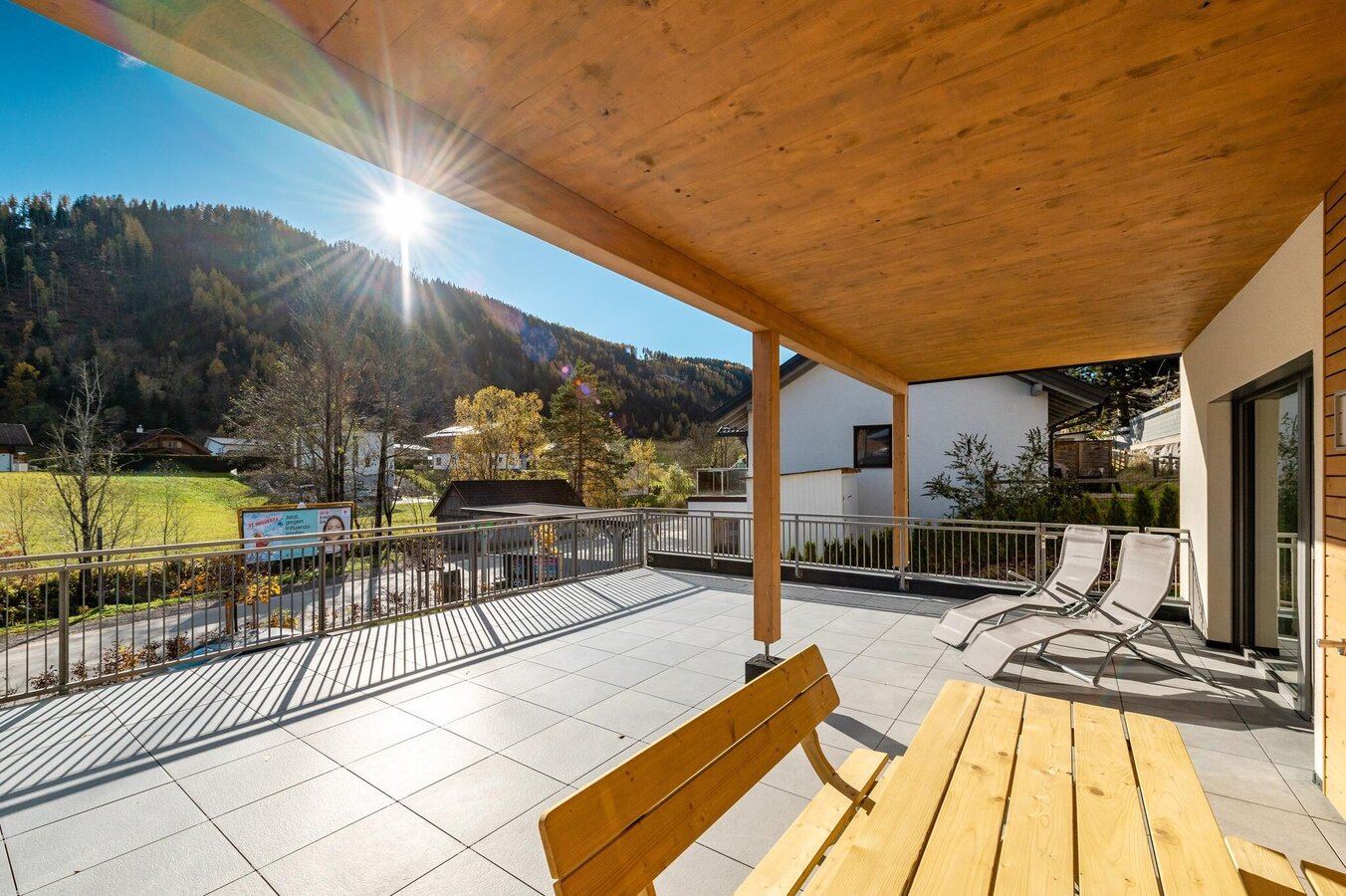 Die große Terrasse ist der perfekte Ort, um den Ausblick auf die umliegende Berglandschaft zu genießen.