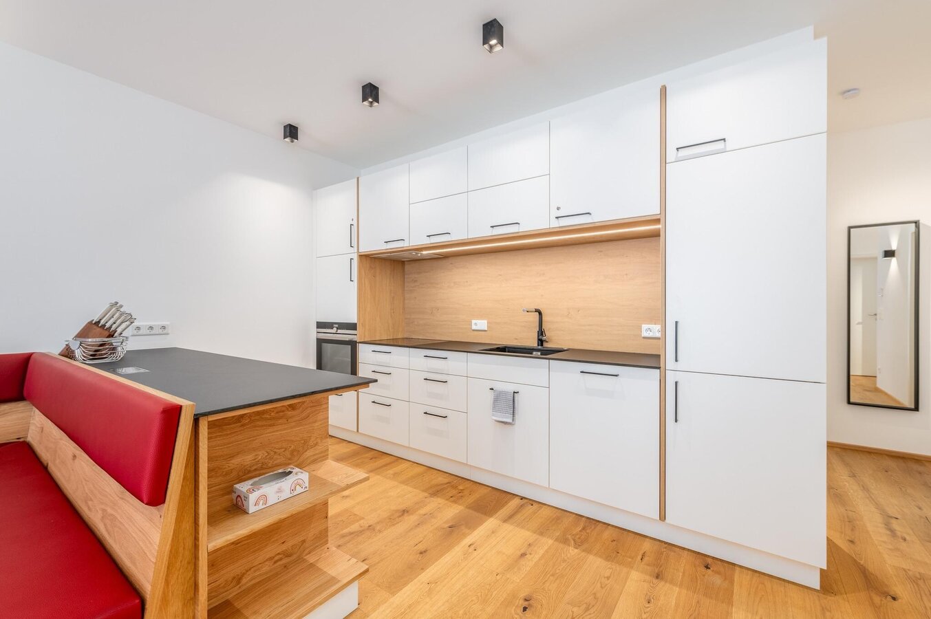Neben einer voll ausgestatteten Küche gibt es in dieser neuen Ferienwohnung 2 SZ mit je einem Doppelbett. Zusätzlich gibt es im Wohnzimmer eine Schlafcouch für 2 weitere Personen.
