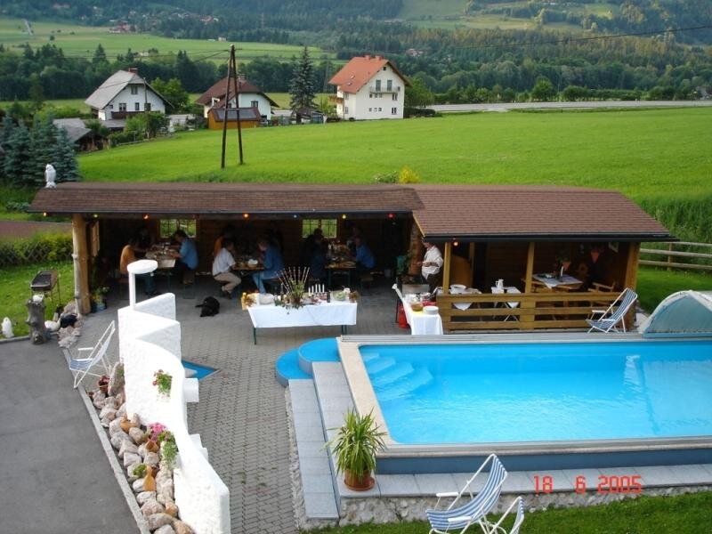 Mit den Skiern zum Lift - von der Piste zur Pension! Lassen Sie sich verwöhnen und genießen Sie ihren Urlaub in ruhiger, kinderfreundlicher Umgebung in Komfortzimmern. Mit einem umfangreichen Frühstücksbuffet und unserer guten Küche sorgen wir auch für Ihr leibliches Wohl (u.a. Bauernbuffet, mexikanisches und italienisches Buffet). Auf Wunsch veranstalten wir im Sommer für Gruppen Pool-Partys und Grillabende. Tanken Sie Energie und Erholung beim Schwimmen in unserem geheizten Freibad, um gestärkt in den Alltag zurückkehren zu können. Alle Zimmer mit TV. Sommer 2006 Ab jetzt vermieten wir unser Haus bzw. unsere Zimmer auch als SELBSTVERSORGER (Gruppen und Familien). Preis/Person: € 19,00 - Bettwäsche inkludiert!
