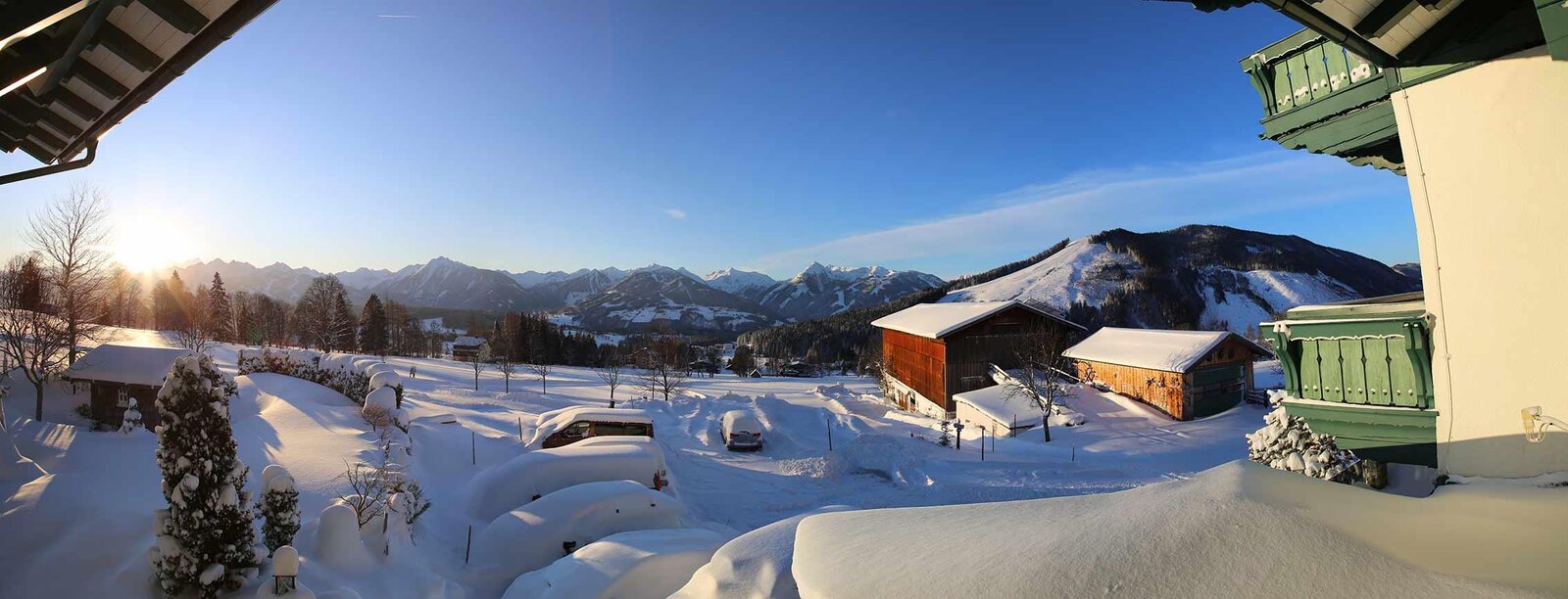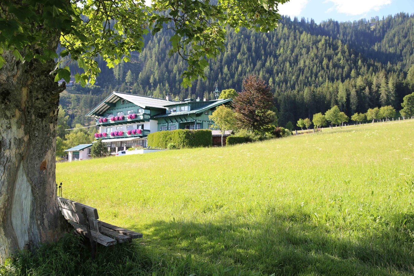Oberhalb der Hauptstrasse auf einer leichten Anhöhe im Ortsteil Schildlehen, offenbart sich unseren Gästen ein faszinierender Panoramablick über die Bergwelt der Schladminger Tauern oder auf den Ski- und Erlebnisberg Rittisberg. Am Fuße des Dachsteins, umgeben von den eigenen grünen Wiesen bieten wir den perfekten Ausgangpunkt für Wanderungen, Mountainbike- oder Klettersteig- und Skitouren. Sie erreichen direkt vom Haus den Einstieg zur klassischen- oder Skatingloipe, 70km Winterwanderwege oder den Kinderskilift. In nur 10 Gehminuten finden Sie ein Sportgeschäft mit Skiverleih, die örtliche Kinderskischule oder die 3,5 km lange Nachtrodelbahn.