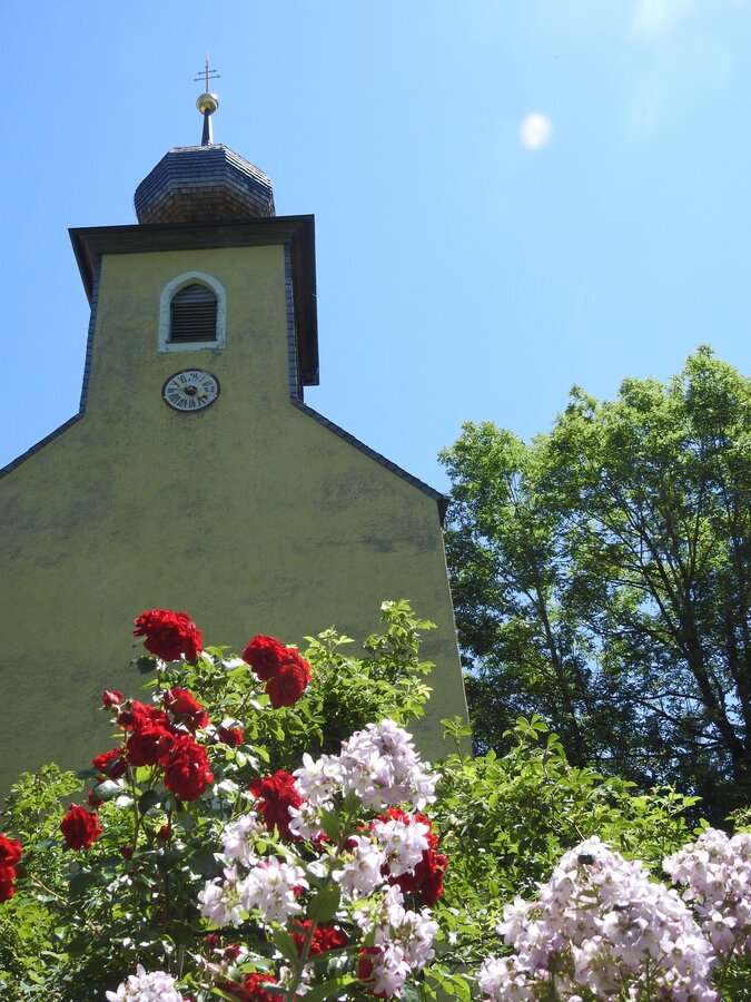 Die äußerlich schlichte, im Westen über dem Haupteingang von einem Turm mit Kuppeldach überragte Kirche bildet mit dem benachbarten Schloss ein Bauensemble. Um den gemeinsamen Innenhof verläuft eine 11 m hohe und 2,50 m dicke Ringmauer, die den einst wehrhaften Charakter noch heute erkennen lässt.