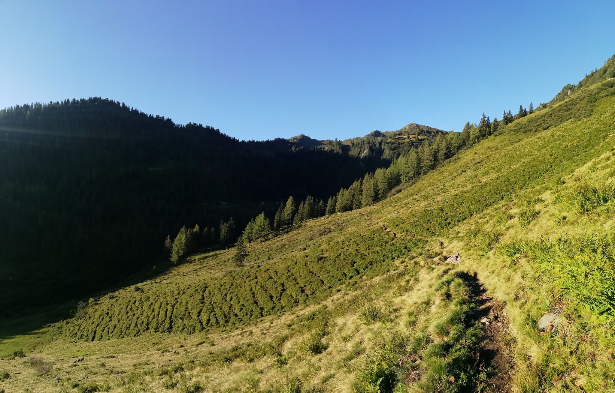 - Bis zur Mößnascharte weiterlaufen und über die Vordere Mörsbachalm auf die beschriebene Route zur Hintere Mörsbachalm laufen und dort dem Track weiterfolgen (+7,1 km, +380 hm)