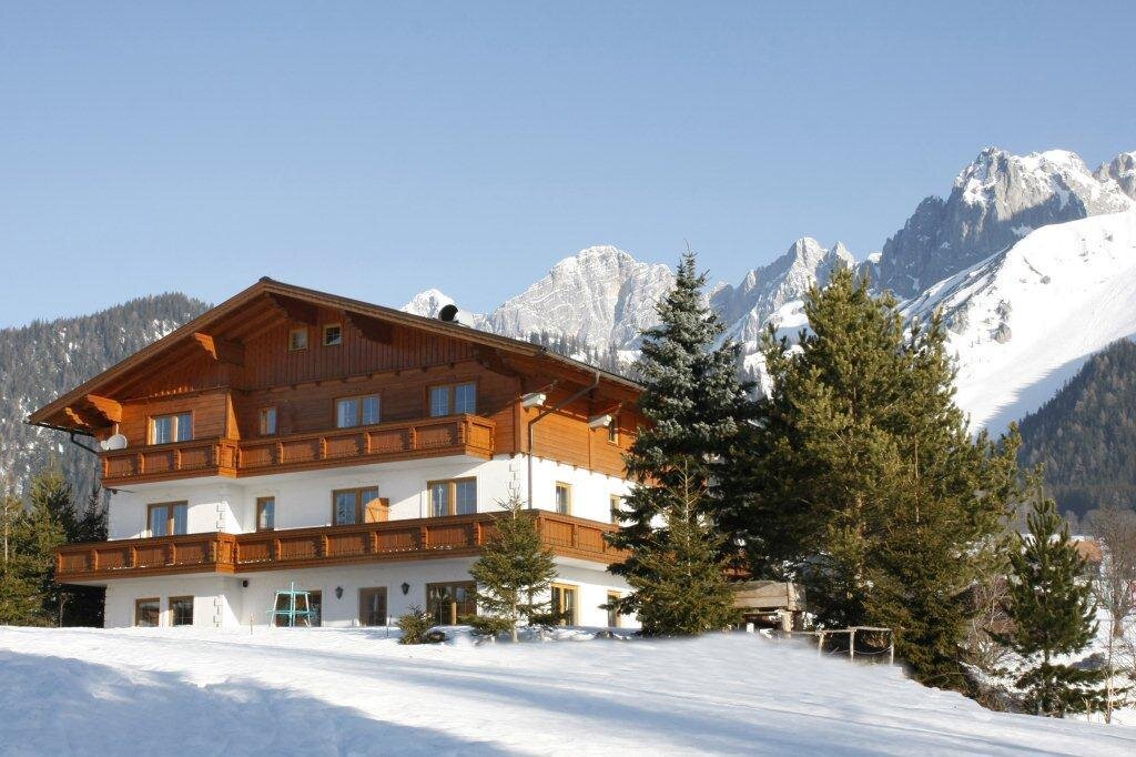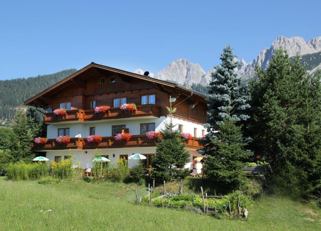 Verbringen Sie einen unvergesslichen Urlaub im Haus Schöne Aussicht in traumhafter Lage in Ramsau am Dachstein. In gemütlicher, familiärer Atmosphäre können Sie den Alltag hinter sich lassen und Ihre Urlaubstage in vollen Zügen genießen. Möchten Sie den Urlaub lieber gemütlich entspannt oder doch lieber sportlich aktiv gestalten, unser Haus ist der ideale Ausgangspunkt für Ihre Aktivitäten in Ramsau und Schladming-Dachstein. Ob im Winter oder im Sommer, Sie finden bei uns eine große Vielfalt an Sport- und Freizeitmöglichkeiten vor, die Erwachsene und Kinder begeistern werden. Die Winter- und Sommerwanderwege führen direkt an unserem Haus vorbei, ebenso die Langlaufloipen im Winter. Das Langlaufstadion in Ramsau Ort ist in 5 min mit den Langlaufskiern erreichbar, wo Sie sogar bis 21 Uhr am Abend eine Nachtloipe mit Flutlichtanlage vorfinden. Die Bushaltestelle befindet sich direkt vor dem Haus. Ländlich - heimelig – kuschelig, der Hausname Schöne Aussicht sagt schon alles! Im Haus Schöne Aussicht fühlen Sie sich zu jeder Jahreszeit wie zu Hause. Das gemütliche Ambiente und eine liebevoll und komfortabel eingerichtete, komplett ausgestattete Ferienwohnung lädt zum Entspannen und zum Erholen ein: Wohnzimmer, Küche, Schlafzimmer mit Dusche und getrennten WC sowie ein Balkon, wo Sie einen unvergesslichen Blick auf die umliegende Bergwelt der Schladminger Tauern oder auf das Dachsteinmassiv genießen können. W-Lan und Bettwäsche steht Ihnen kostenlos zur Verfügung. Auf Wunsch bieten wir auch Brötchenservice an. Gerne verwöhnen wir Sie auch in unserem a la carté Restaurant am Abend durch eine sorgfältig ausgewählte Speisekarte mit verschiedensten heimischen und internationalen Spezialitäten verzaubert persönlich vom Chef des Hauses. Unsere große Sonnenterrasse mit Panoramablick auf die imposante Bergwelt wird Sie begeistern! Die zahlreichen Angebote von Ramsau am Dachstein reichen von Wandern, Klettern, Mountainbiken bis hin zum Sommerrodeln, Reiten, uvm. Bestimmt ist für jedes Familienmitglied etwas dabei, was das Urlauberherz begehrt. Den „abenteuerlichten“ Rittisberg mit Sommerrodelbahn, Hochseilgarten, Segwaystrecke, Barfußweg, Badesee, Kinderspielarena usw. erreichen Sie in 10 Gehminuten. Ein Winterurlaub in Ramsau verspricht Spaß, Abenteuer und Abwechslung für Erwachsene und Kinder. Entdecken Sie das vielseitige Freizeitprogramm in Ramsau am Dachstein in der Steiermark, dem grünen Herz von Österreich. Sie befinden sich inmitten des Top Familienskigebietes Ramsau am Dachstein mit Kalis Erlebnispisten und den täglich neu gespurten Langlauf Loipen, die mit dem Steirischen Loipengütesiegel ausgezeichnet sind. Familie Stocker freut sich darauf, Sie bald im Haus Schöne Aussicht zu begrüßen!