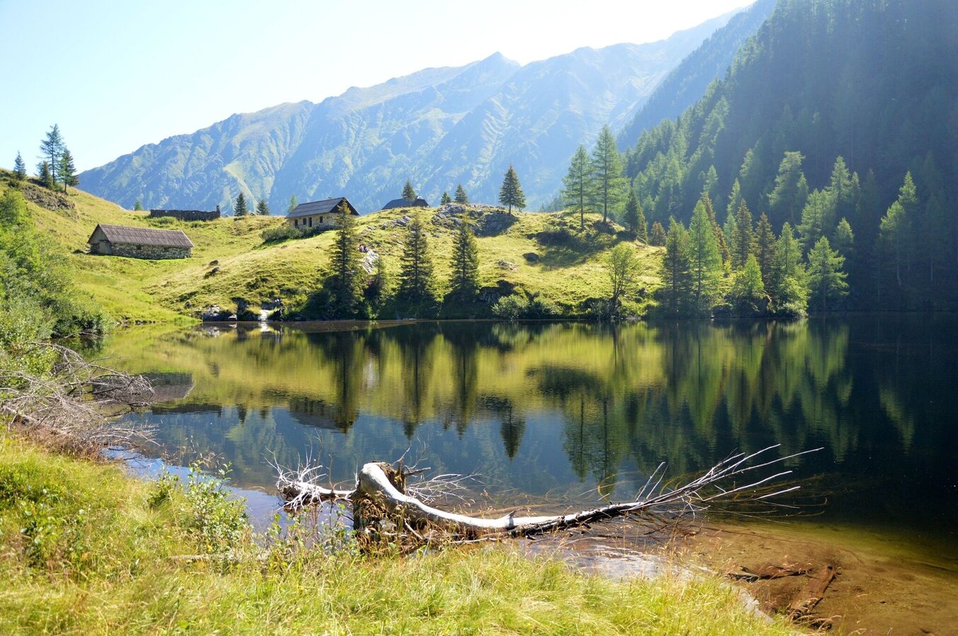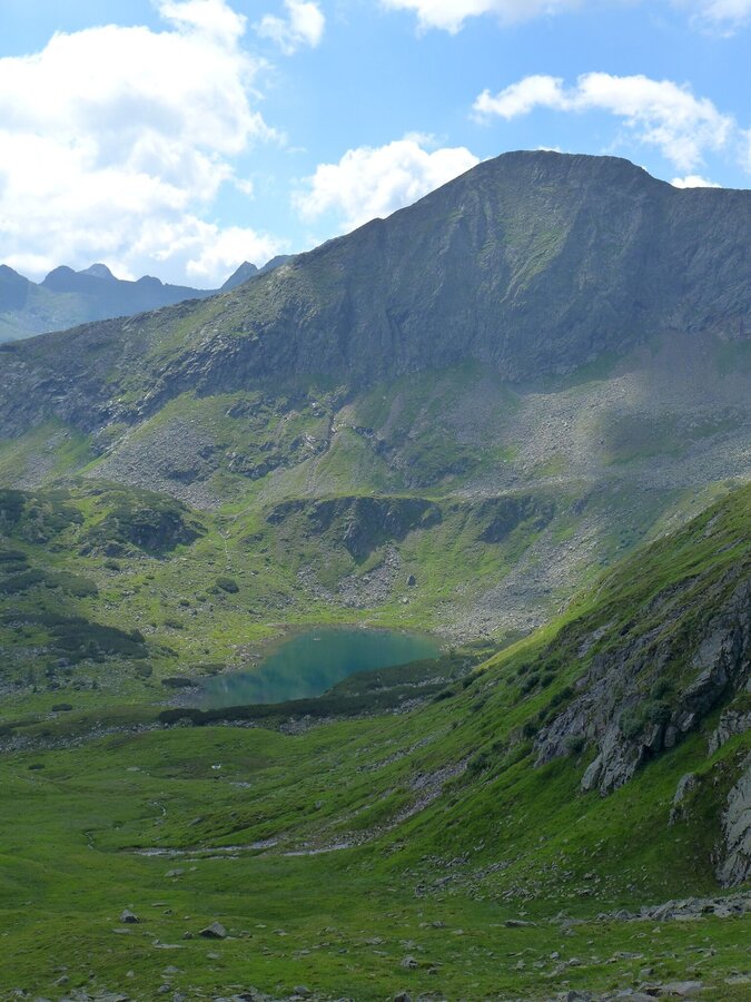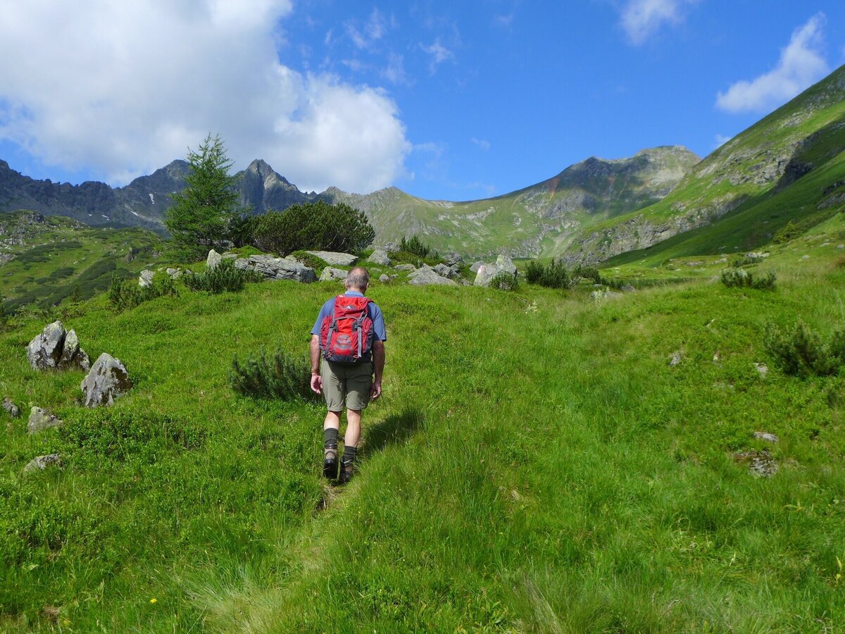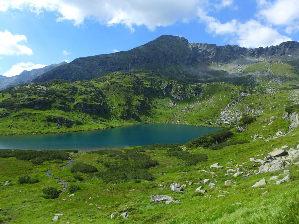 Bald ist der Seekarlsee erreicht. Die extreme türkise Farbe des Sees vermittelt Karibikfeeling in 2.140m Seehöhe. Nach dem Seekarlsee geht es über Almwiesen bergab. Ab 1.900m Seehöhe wird das Gelände steiler. In Serpentinen geht es zur Tuchmoaralm (1.509m). Die Köckhütte und die Blasenalm laden zur Einkehr ein.