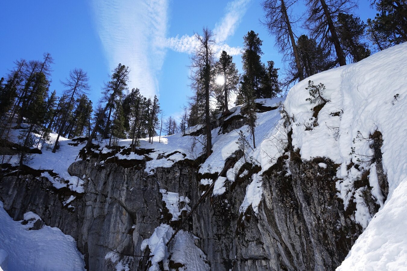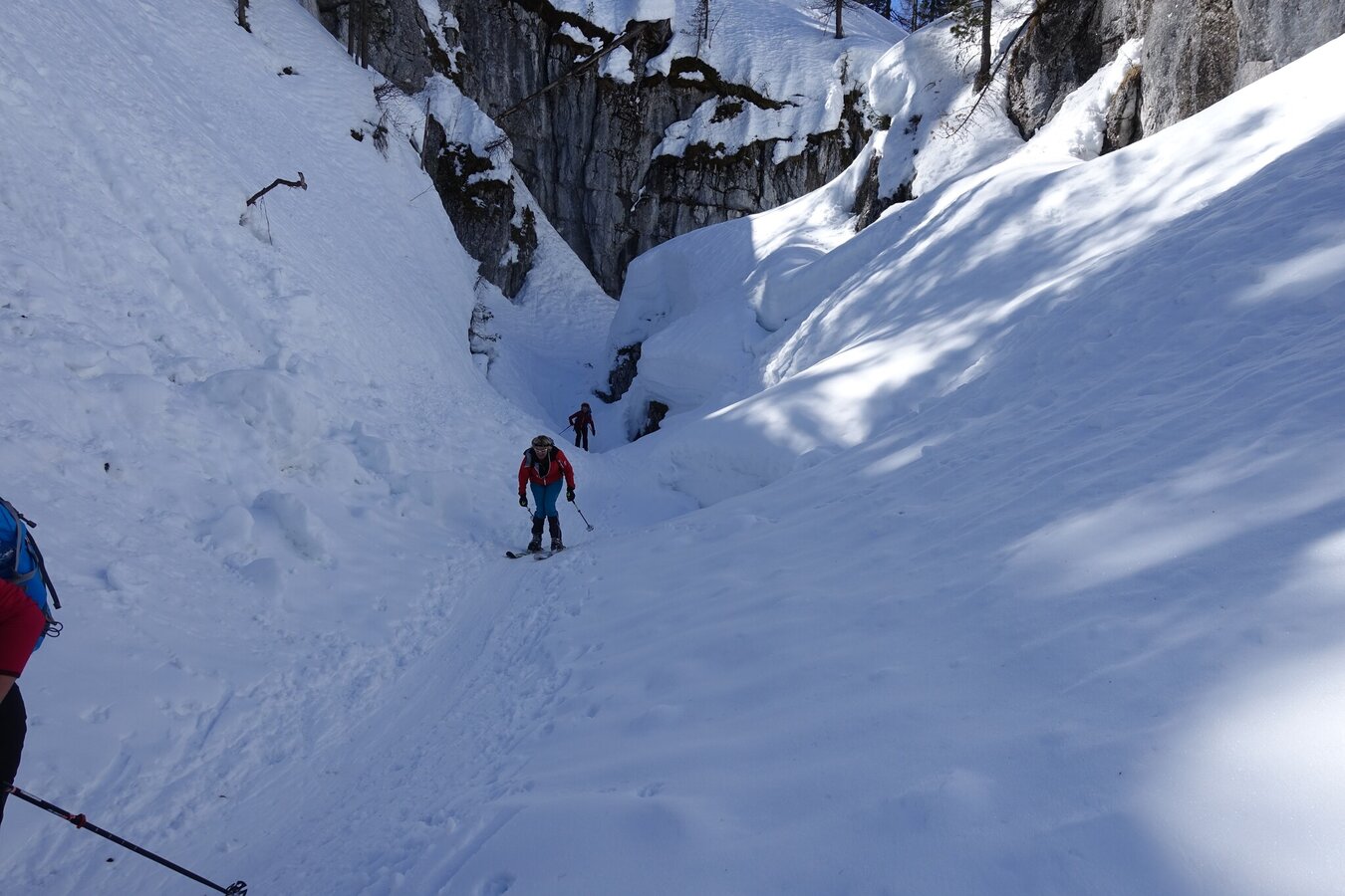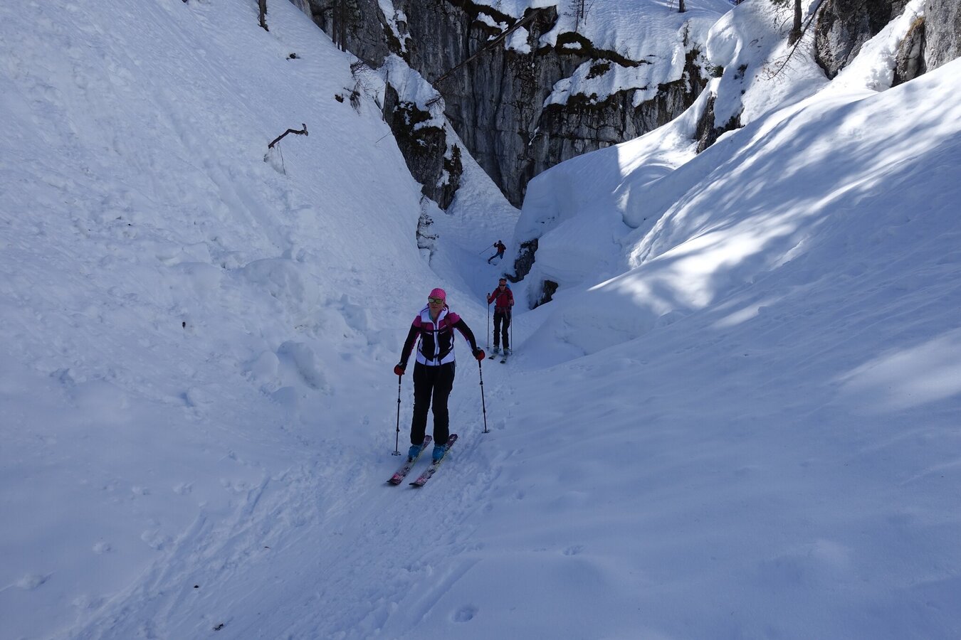 Abfahrt von der Bergstation über den Schladminger Gletscher unter dem stillgelegten Mittersteinsessellift (schöne Nordhänge) bis zur alten Talstation. Von dort durch das kupierte Gelände Richtung Osten (der Stoderzinken ist der dominante Richtungsweiser, die Route ist nur teilweise mit Stangen markiert) gehen - je nach Bedingungen ist diese Tour auch ohne Felle möglich. Auf der Route passierst du die verfallene Lackenmoosalm und die unbewirtschaftete Schildenwangalm. Hier geht es dann durch die beeindruckende Schlucht der Notgasse mit ihren historischen Felsmalereien. Sollten Schneemangel oder die Bedingungen eine Befahrung der Notgasse nicht zulassen kann man die Schlucht auch über einen Forstweg umfahren.